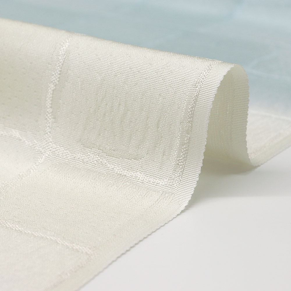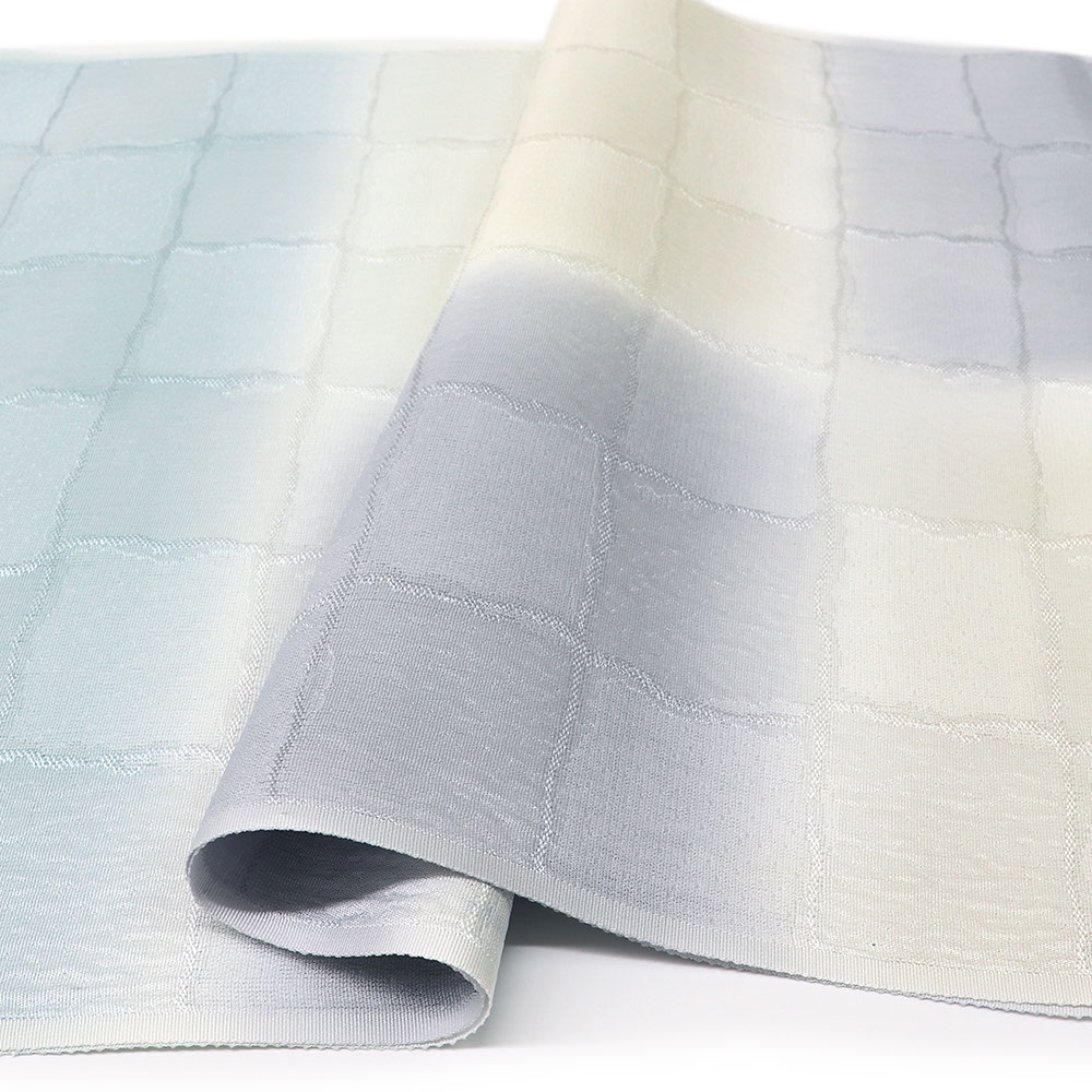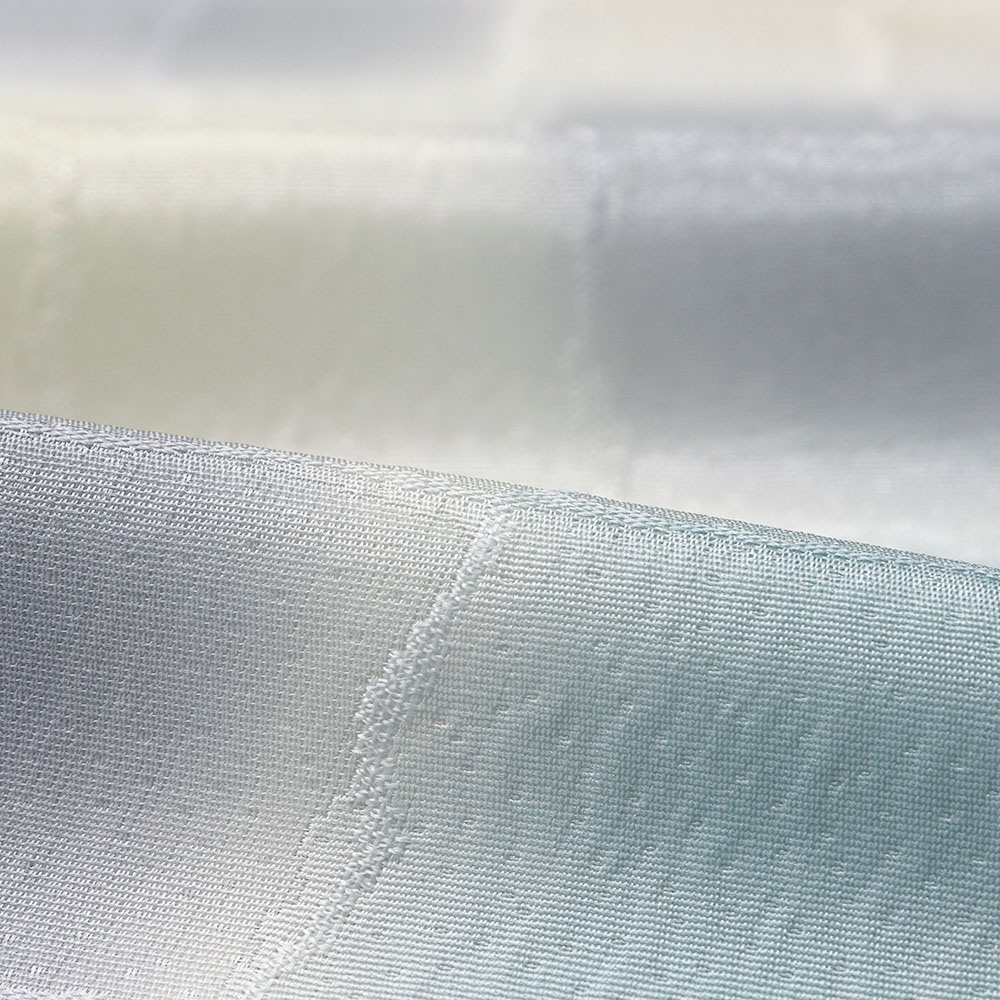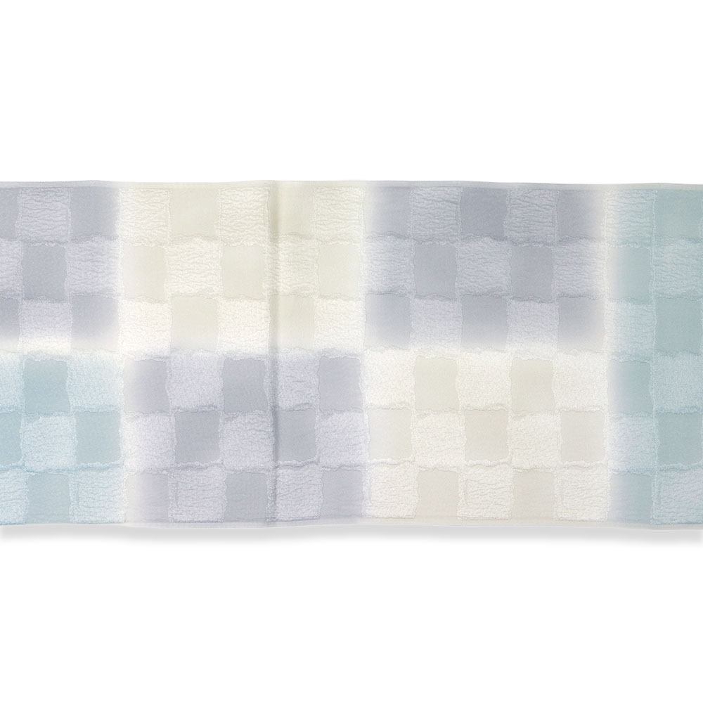 美しい光沢と陰影を生み出す市松地紋に、ぼかしで市松模様を表現した一枚。水色や薄黄を基調にした淡い色合いが、帯周りからコーディネートを優しく支えてくれるデザインです。
