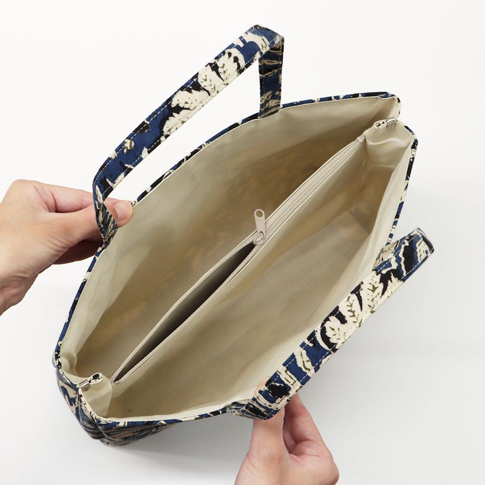 デザイン性だけでなく機能性も高いこちらは、底マチ付きが便利な大容量サイズ。ハリのある丈夫な造りな上に、安定感があり自立するので、床に置いた時や収納する時にもスッキリします。内側にはファスナー付きの仕切りポケットが付いているので、貴重品や口紅などの小物も無くす心配がありません。