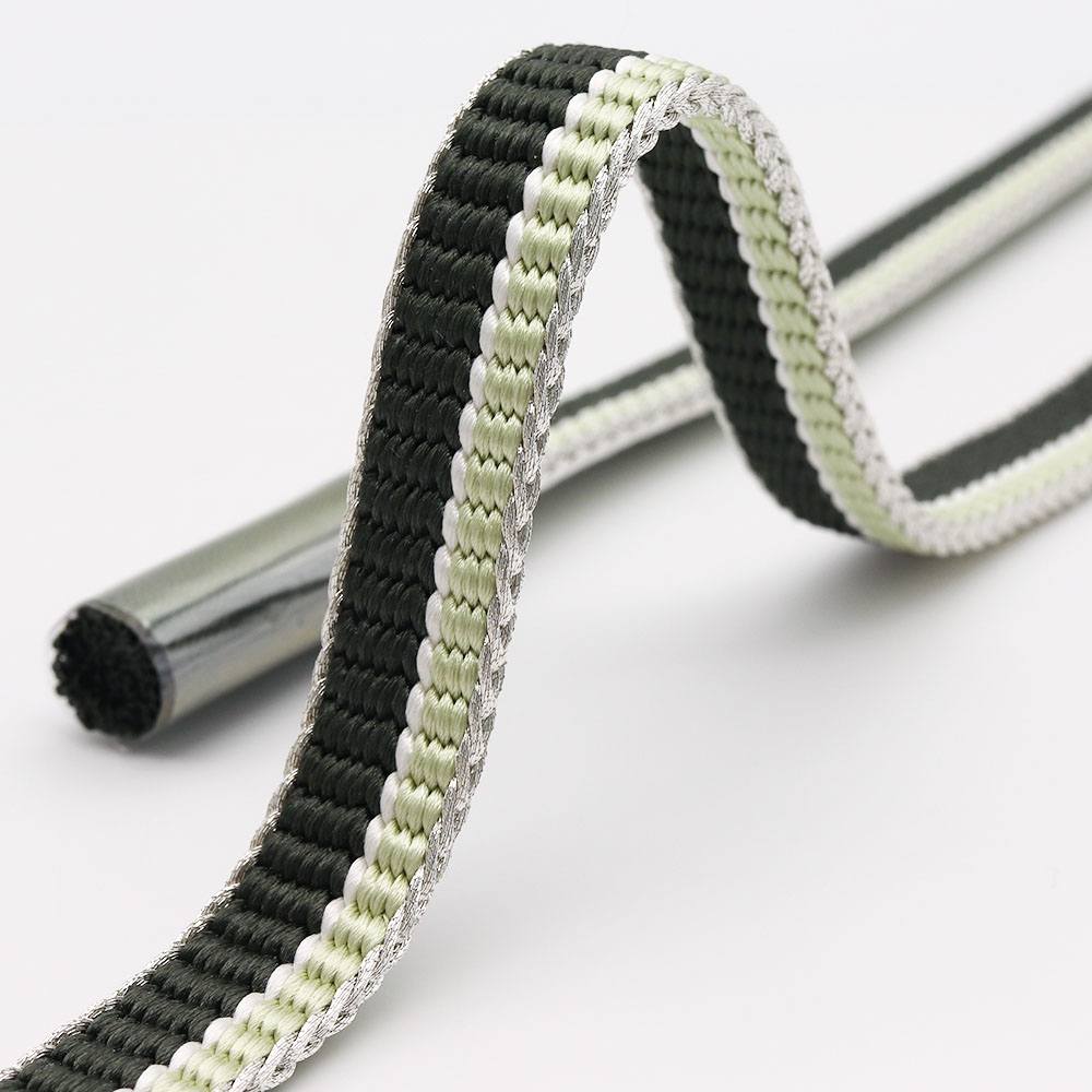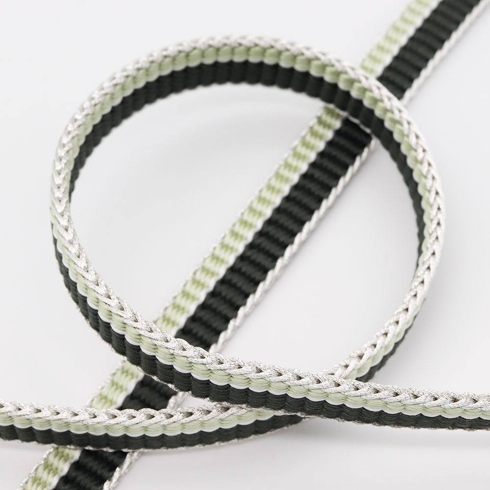 灰緑と薄緑を立別に組んだ色彩豊かなデザイン。銀糸で組まれた耳が着姿のアクセントとなり、その輝きがちょっとした華やかさを与えてくれそうです。お手入れが簡単な撚り房なので、ヘビロテしても房の美しさが長持ちするのも嬉しいですね。