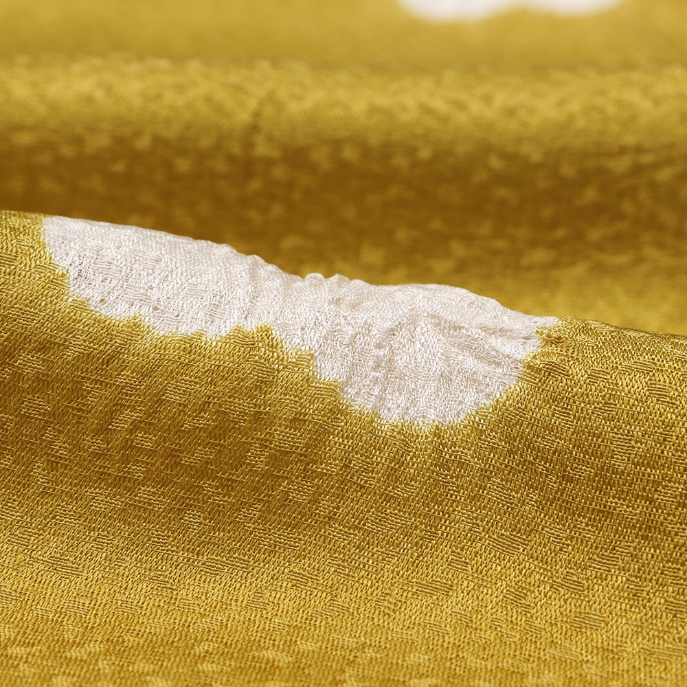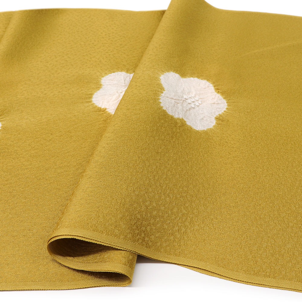 軽やかな風合いの地に、細やかな絞りで小花柄を染めた一枚。ふんわりとした立体感を持つ優しい小花柄が帯の上からちょこんと覗き、帯元の上品なアクセントになってくれます。