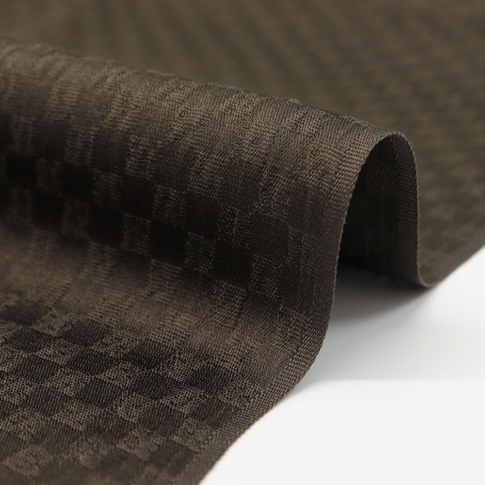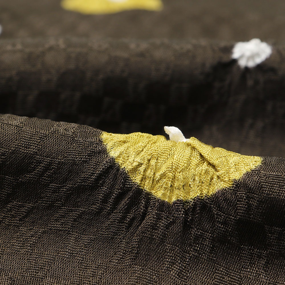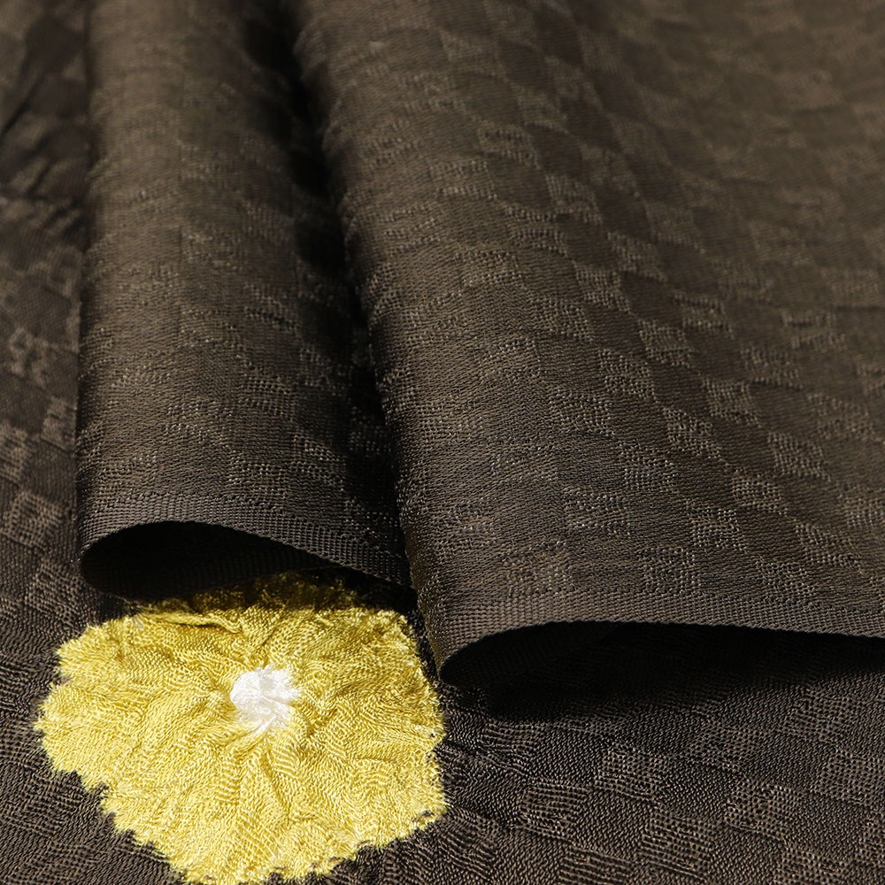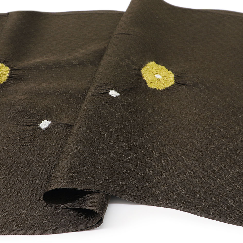 軽やかな風合いの地に細やかな市松地紋を織り出し、細やかな絞りで小花や丸模様を染めた一枚。散らばった小さな絞り模様が帯の上からちょこんと覗き、帯元のさりげないアクセントになってくれます。