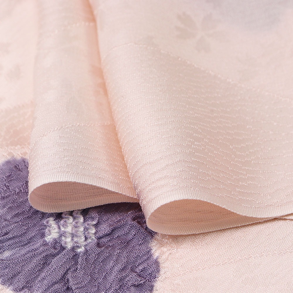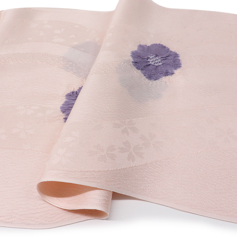 よろけ縞に桜を織り出した地紋に、小花柄を絞り染めで表現した一枚。ふんわりとした立体感を持つ優しい小花柄が帯の上からちょこんと覗き、帯元の上品なアクセントになってくれます。