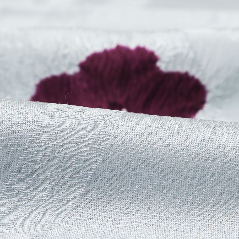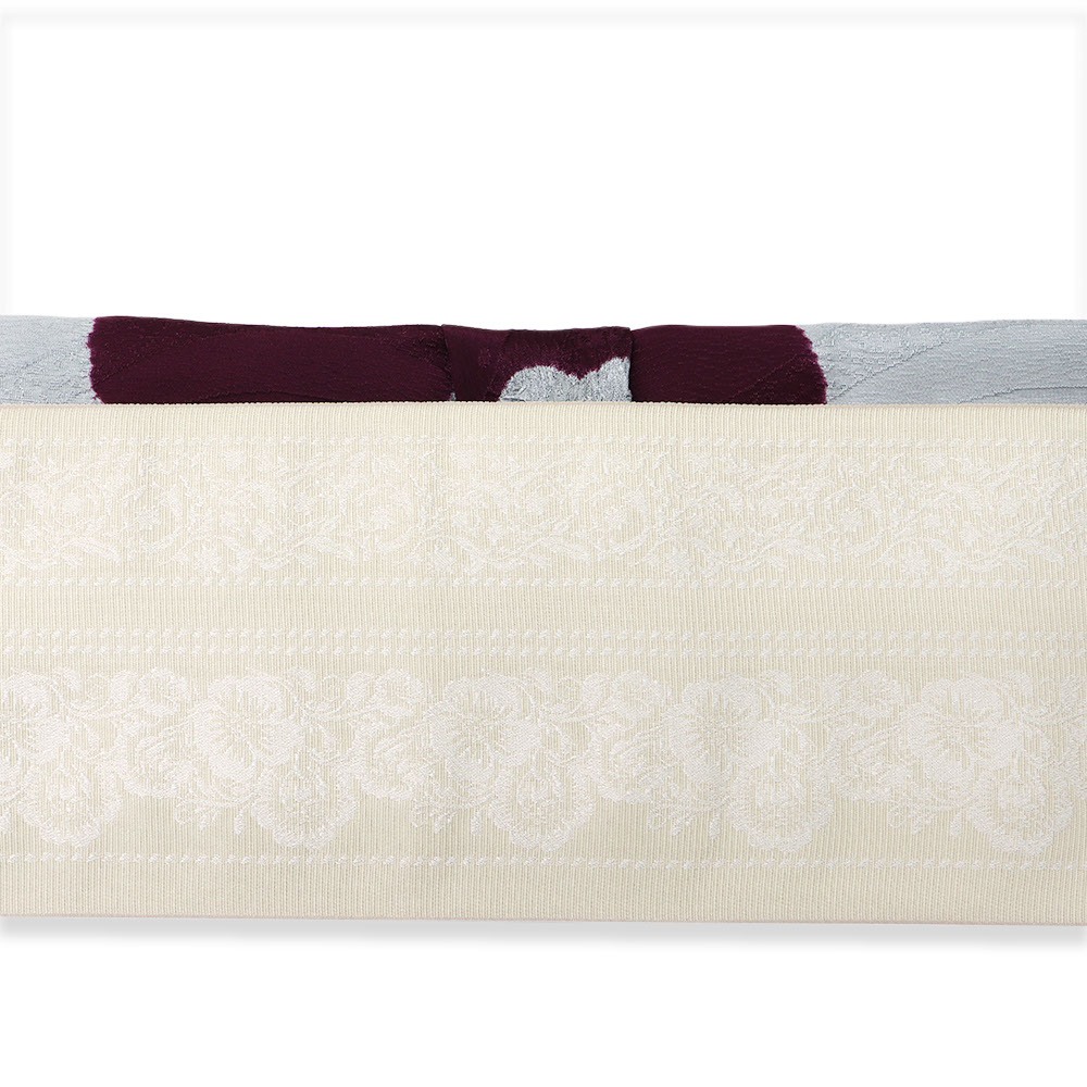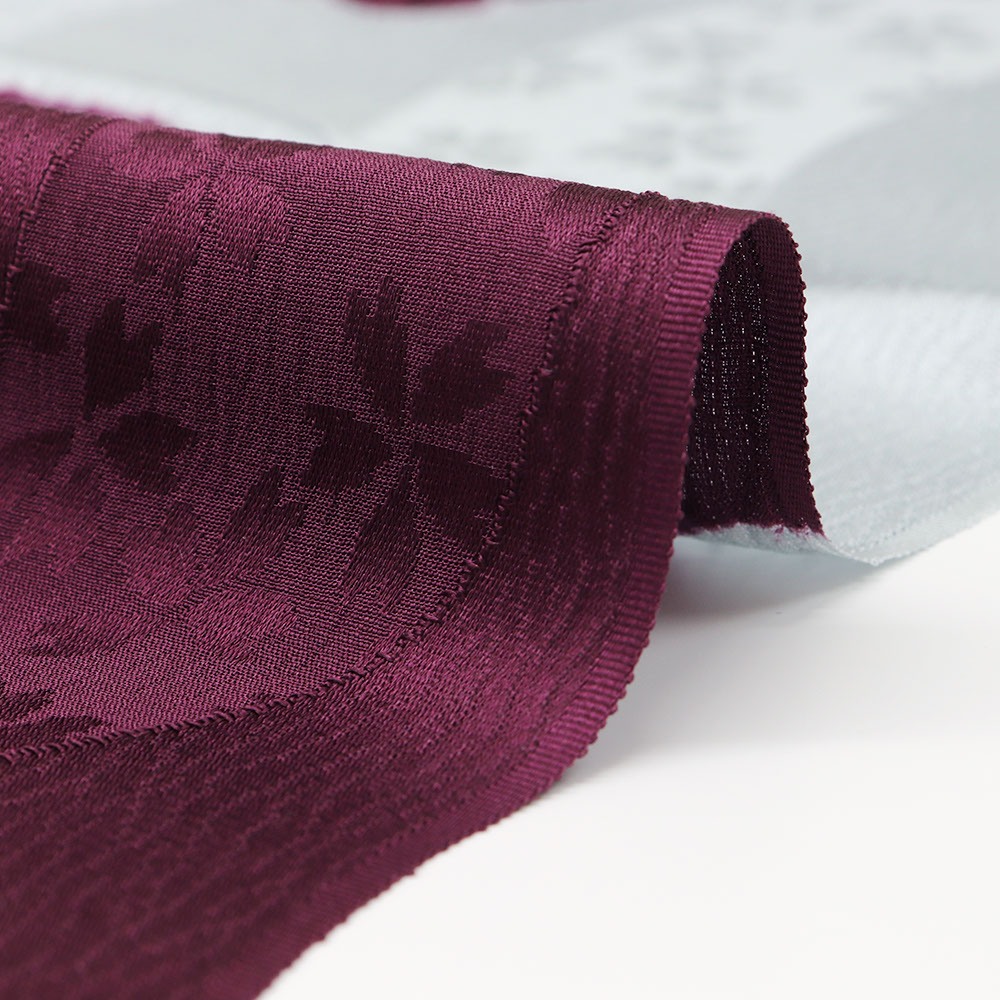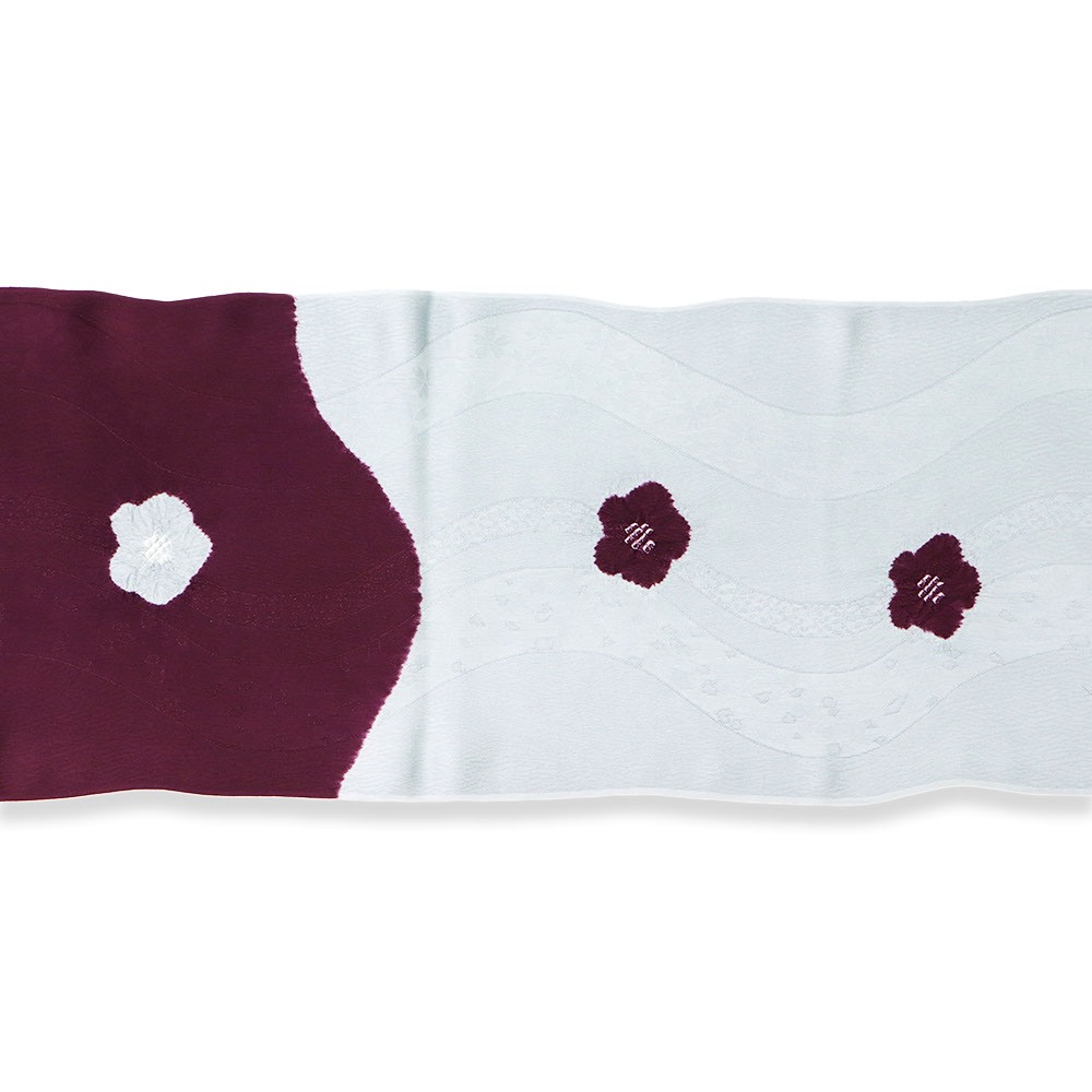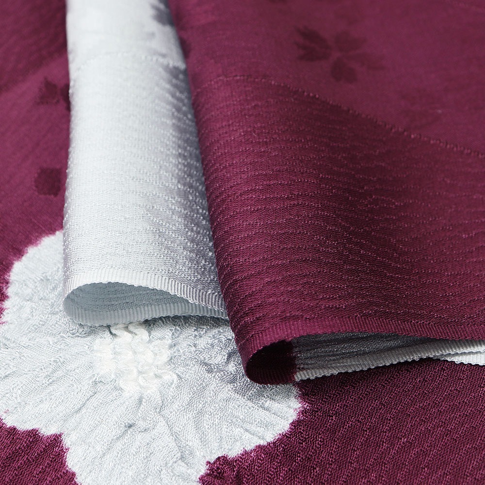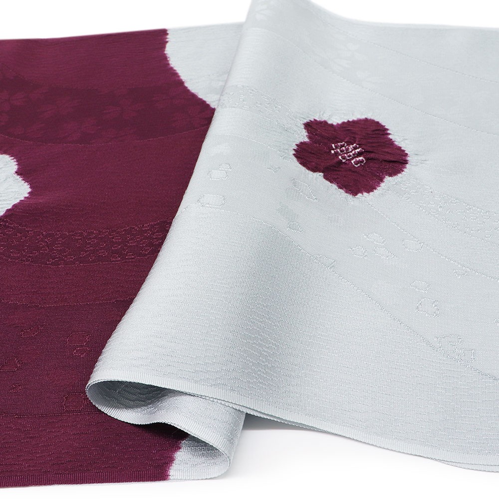 よろけ縞に桜を織り出した地紋に、手先で色を切り替えたデザイン性の高い一枚。赤紫と水色の小花模様は、ふんわりとした優しい立体感を持ち、帯元の上品なアクセントになってくれます。