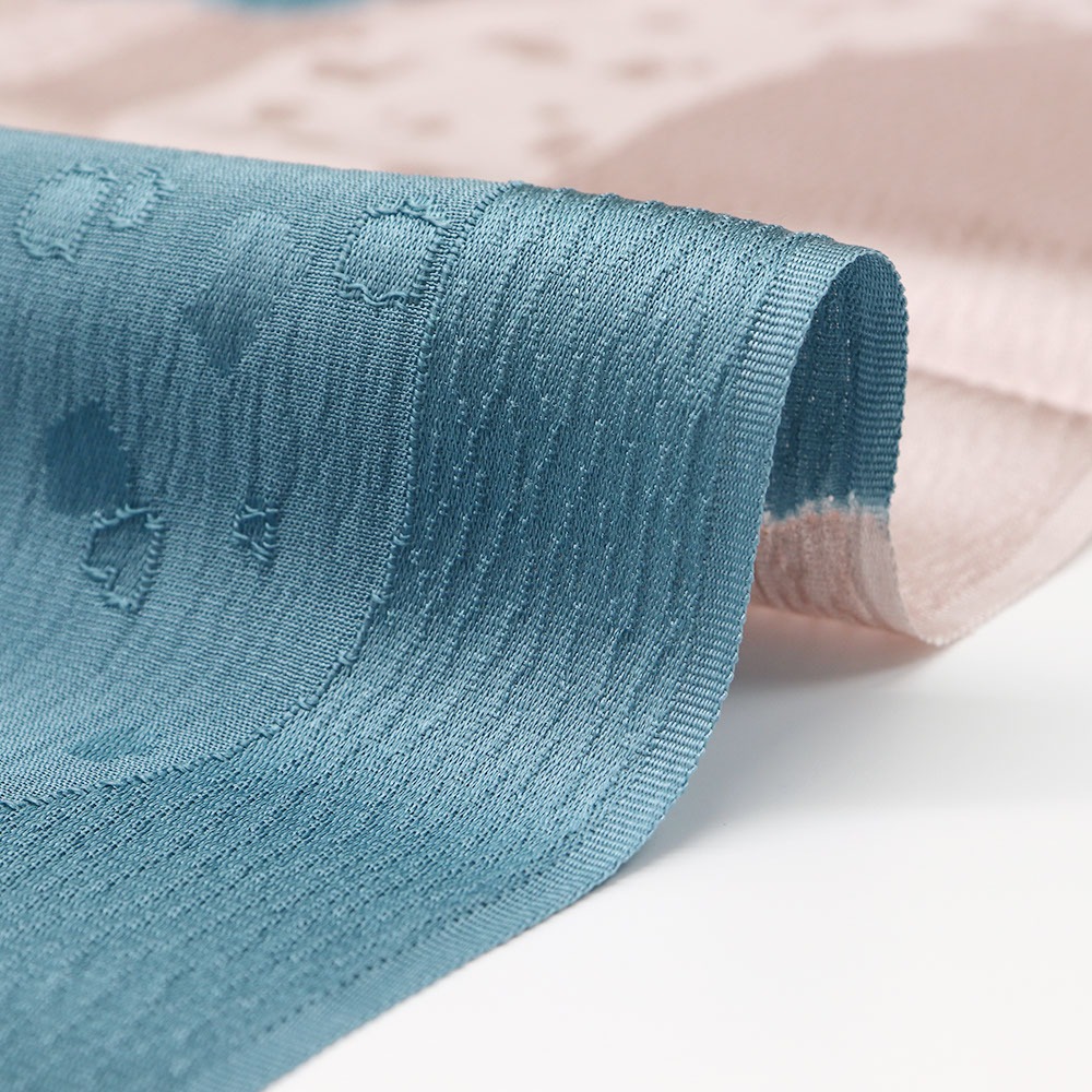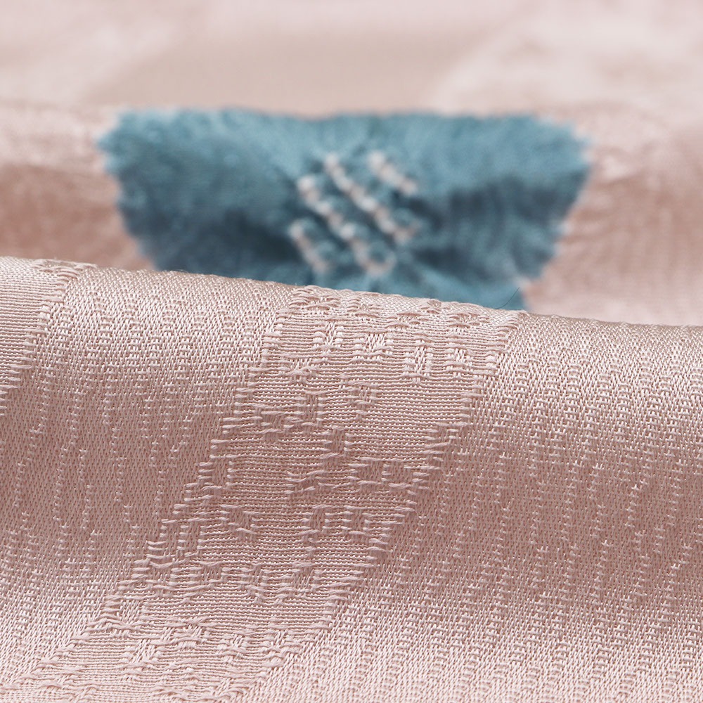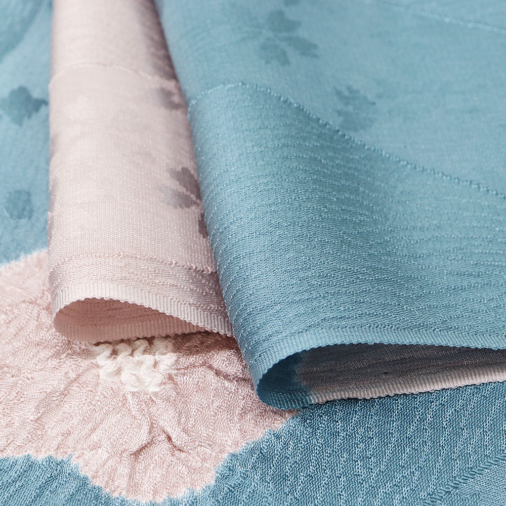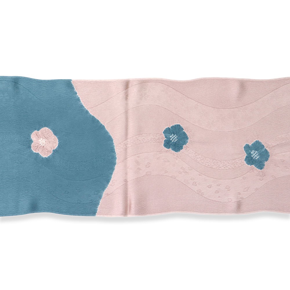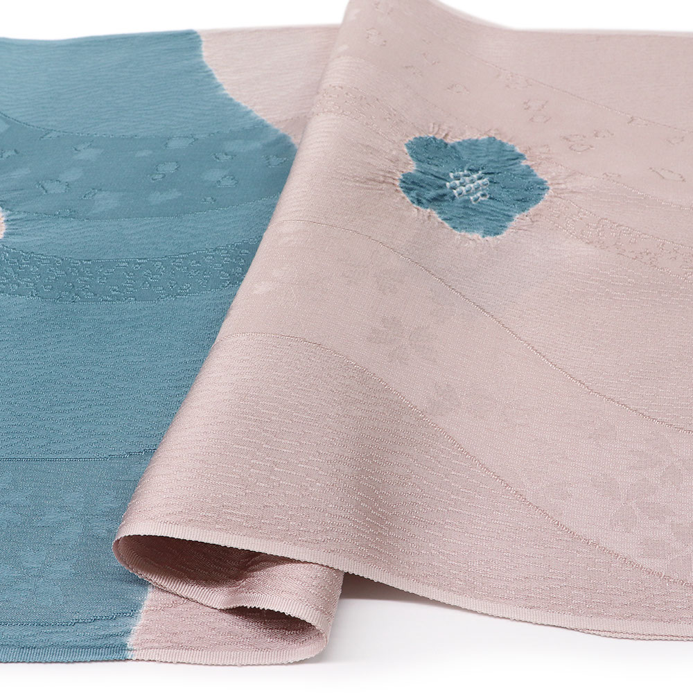 よろけ縞に桜を織り出した地紋に、手先で色を切り替えたデザイン性の高い一枚。空色と薄桃の小花模様は、ふんわりとした優しい立体感を持ち、帯元の上品なアクセントになってくれます。
