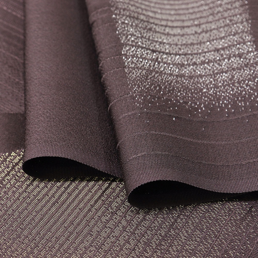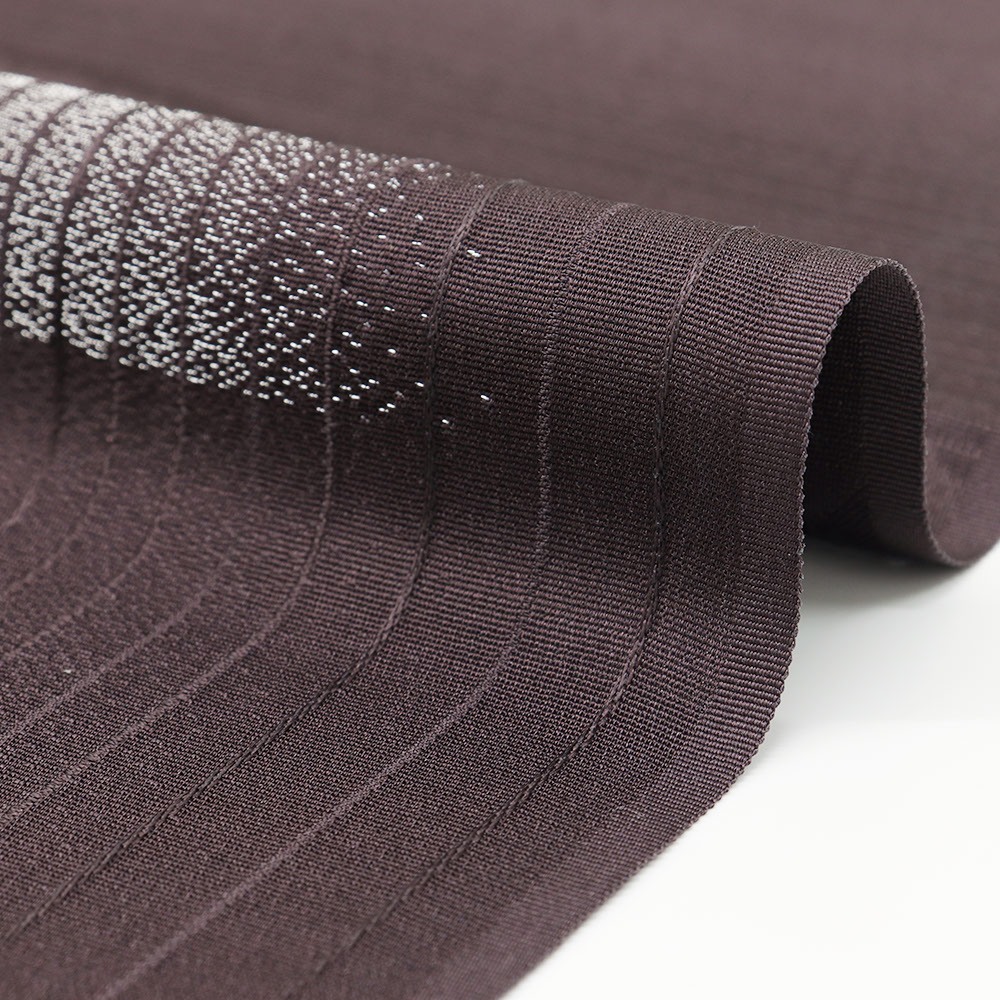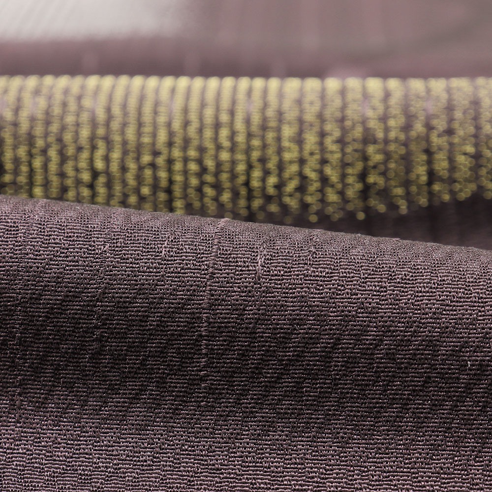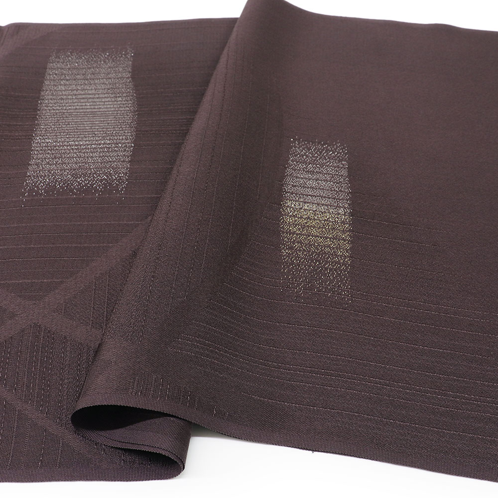 暖かみのあるけし紫色に、大きく弧線を織り出した流麗な雰囲気の一枚。箔糸で表現された角ぼかしの細やかなきらめきが、帯元を彩ります。ほどよいハリのある質感で、生地のうねりに合わせて美しい陰影を見せてくれ、帯揚の形も綺麗に決まります。