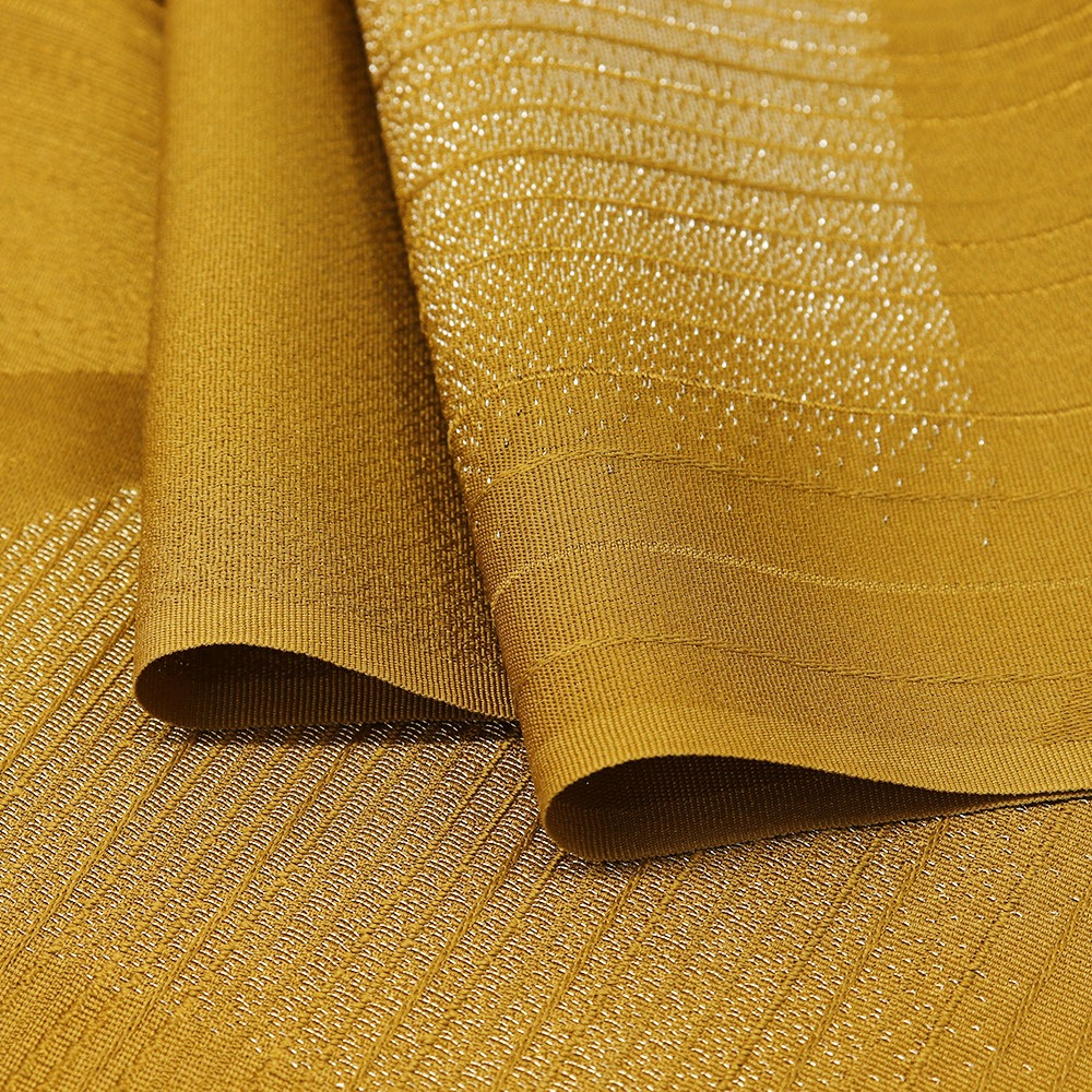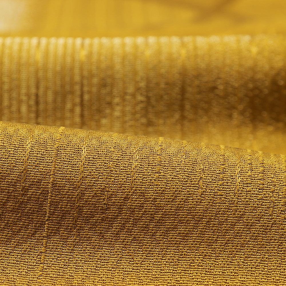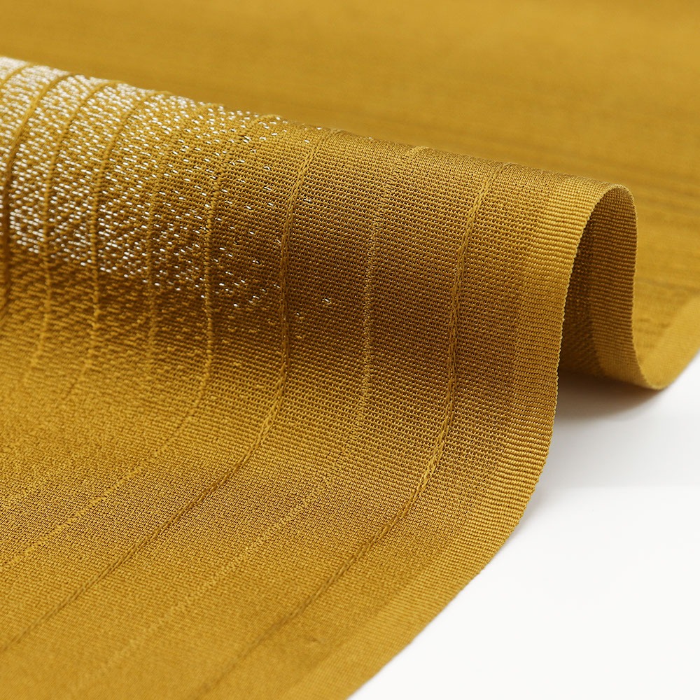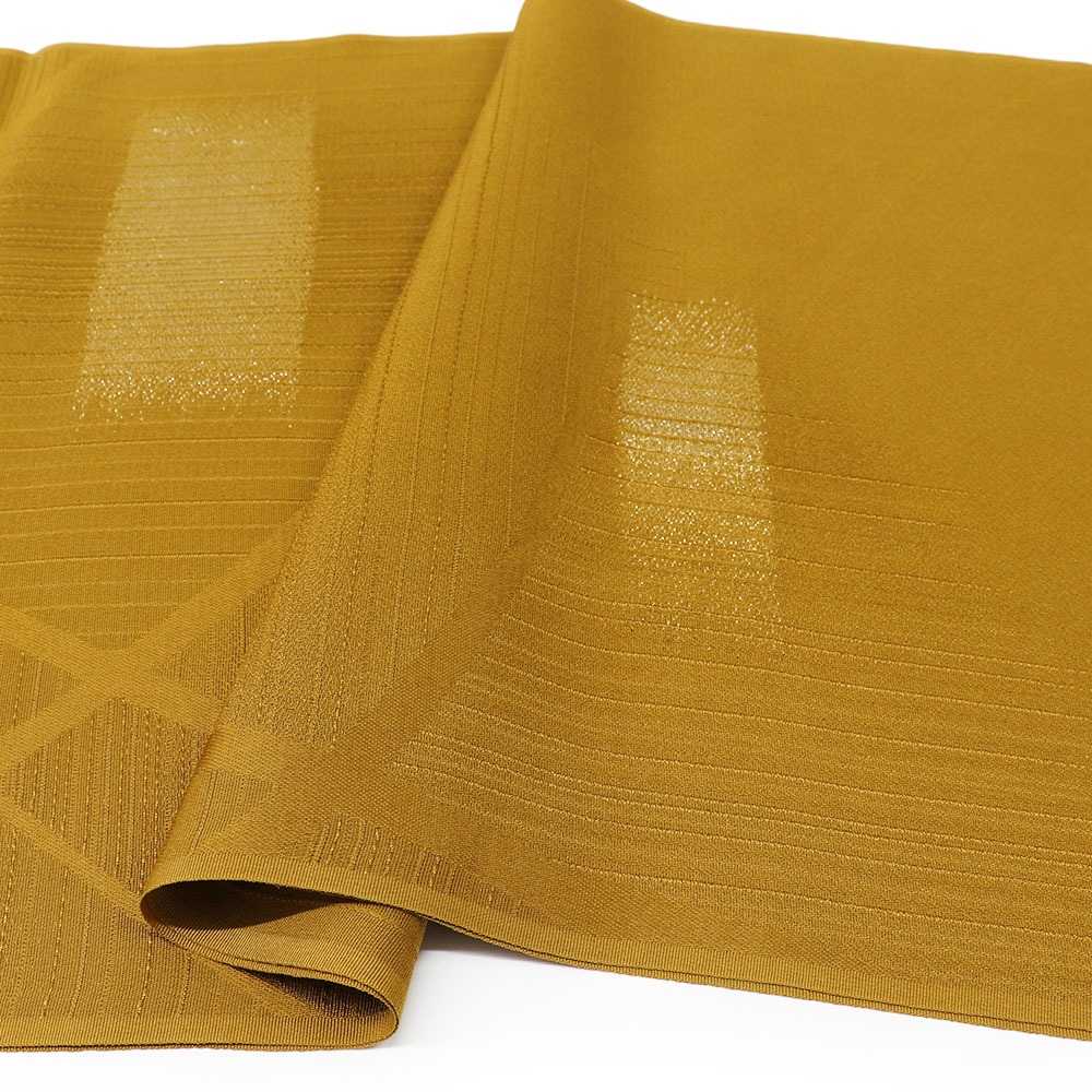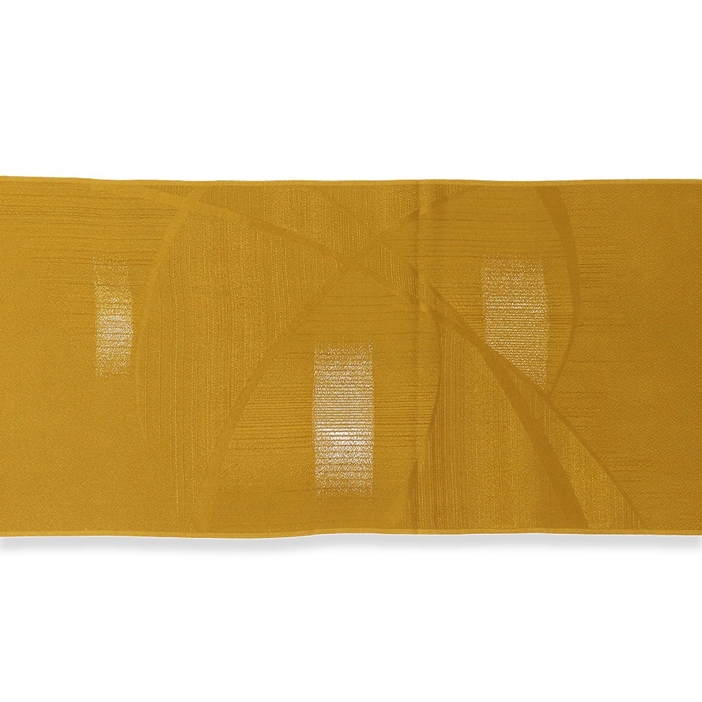 鮮やかな金茶色に、大きく弧線を織り出した流麗な雰囲気の一枚。箔糸で表現された角ぼかしの細やかなきらめきが、帯元を彩ります。ほどよいハリのある質感で、生地のうねりに合わせて美しい陰影を見せてくれ、帯揚の形も綺麗に決まります。