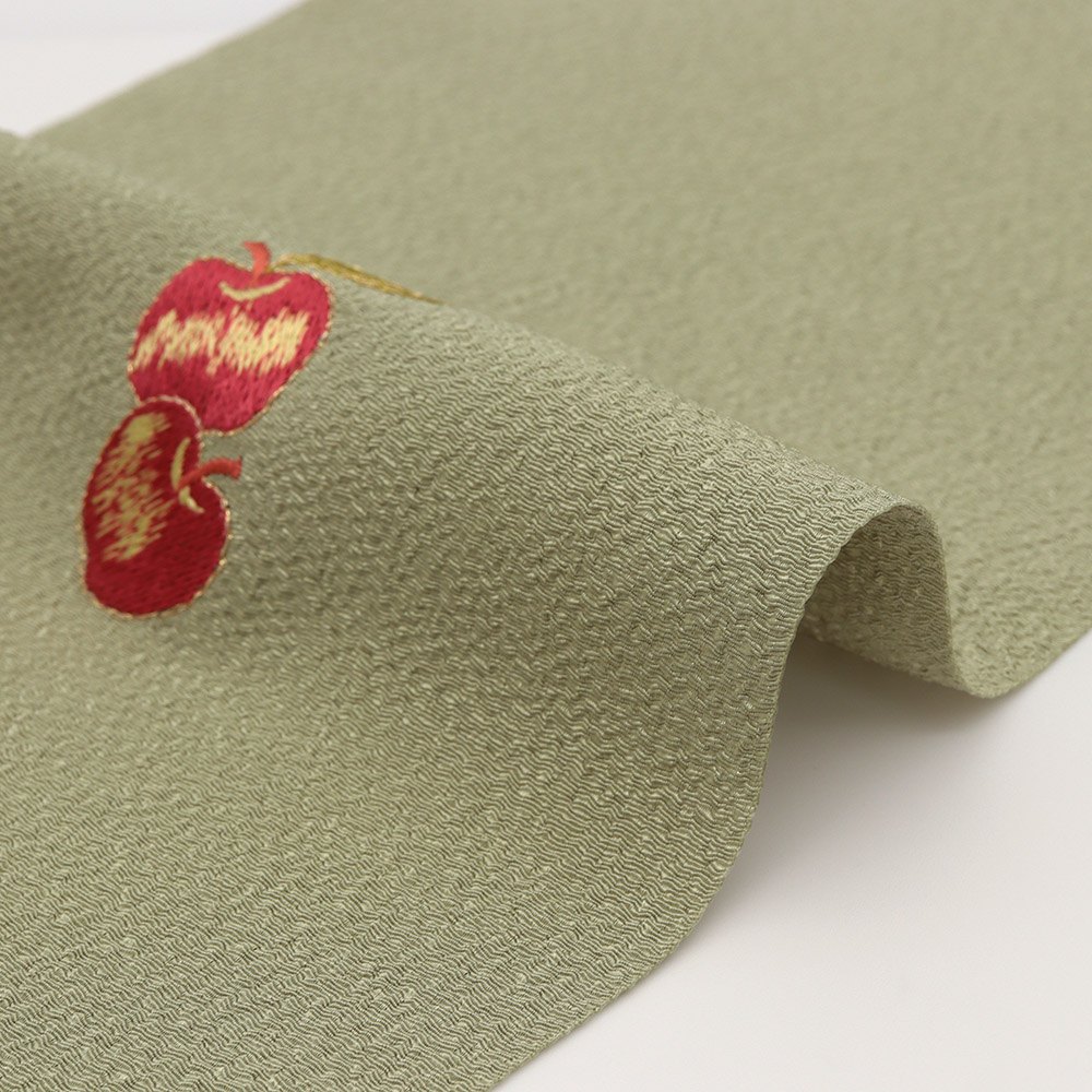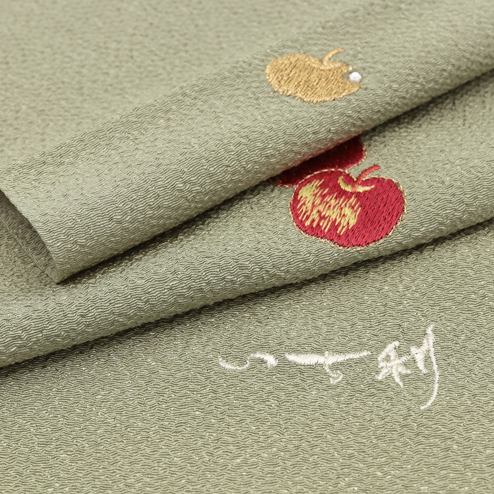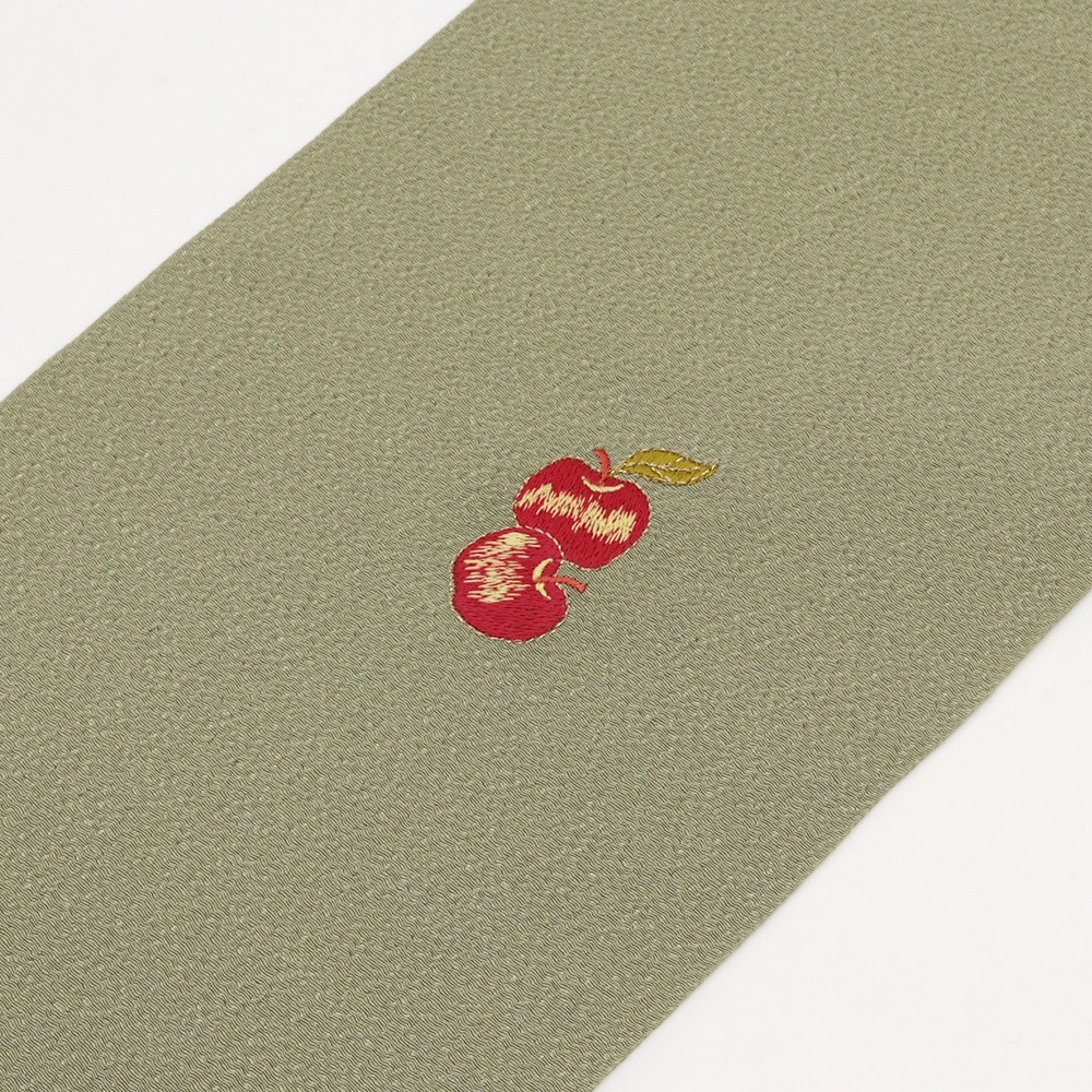 落ち着いた柳茶色地に、幸運を呼ぶ縁起物とされるりんごを刺繍した一枚です。