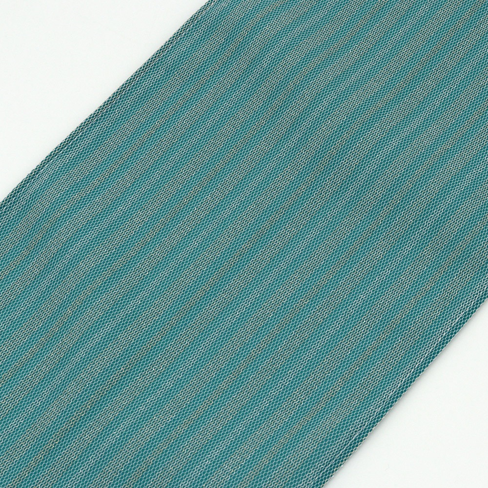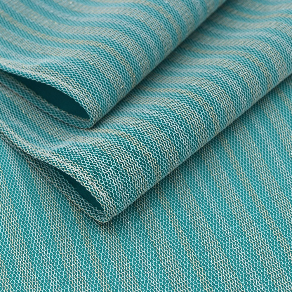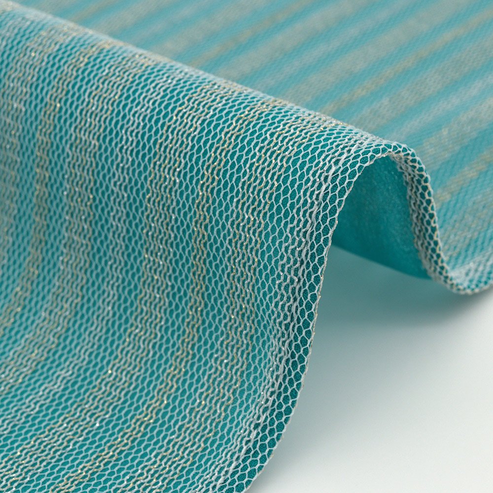 表にはストライプ柄のラメ入りレース生地、裏にはターコイズのシフォン生地をチョイスし、ボンディング加工を施した一枚です。