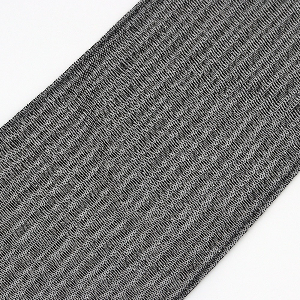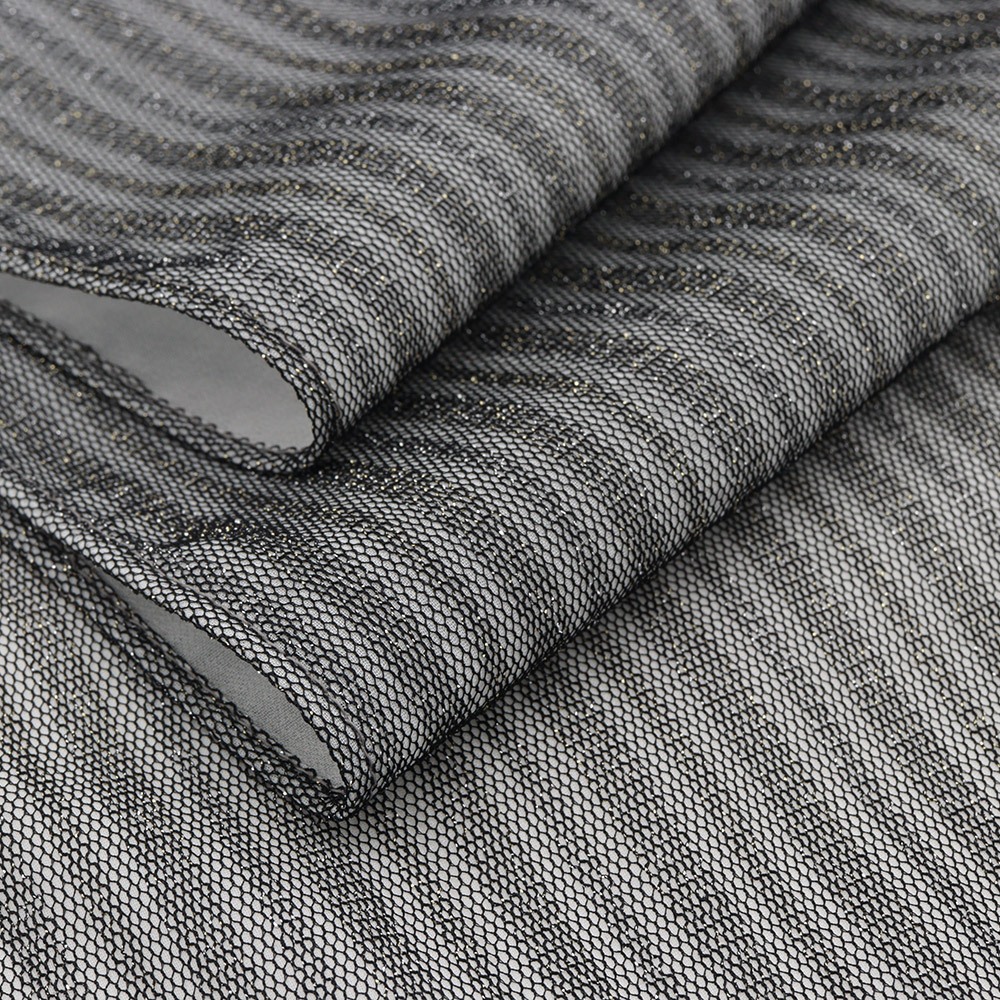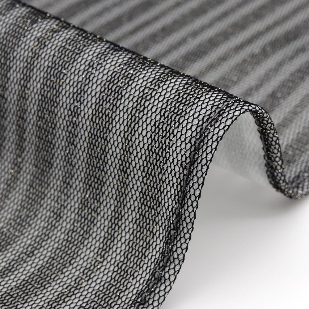 表にはストライプ柄のラメ入りレース生地、裏にはライトグレーのシフォン生地をチョイスし、ボンディング加工を施した一枚です。