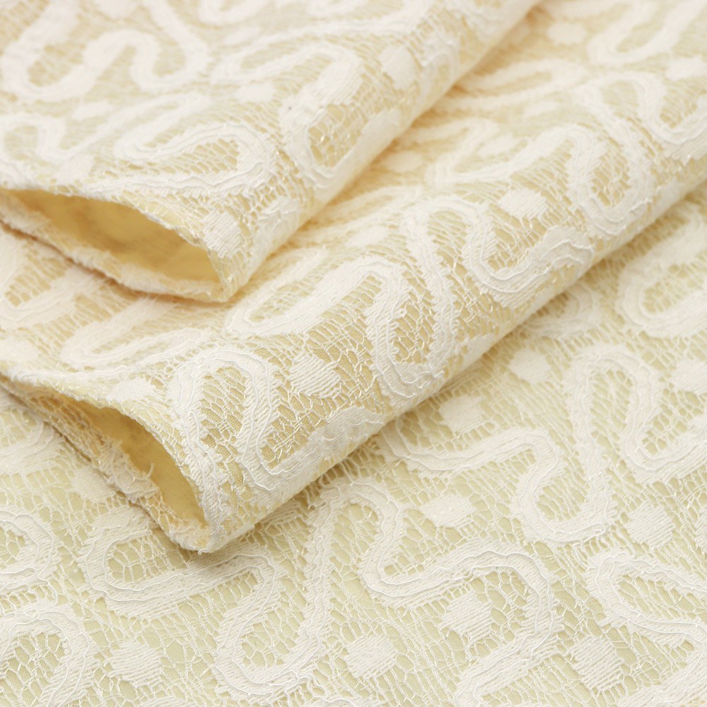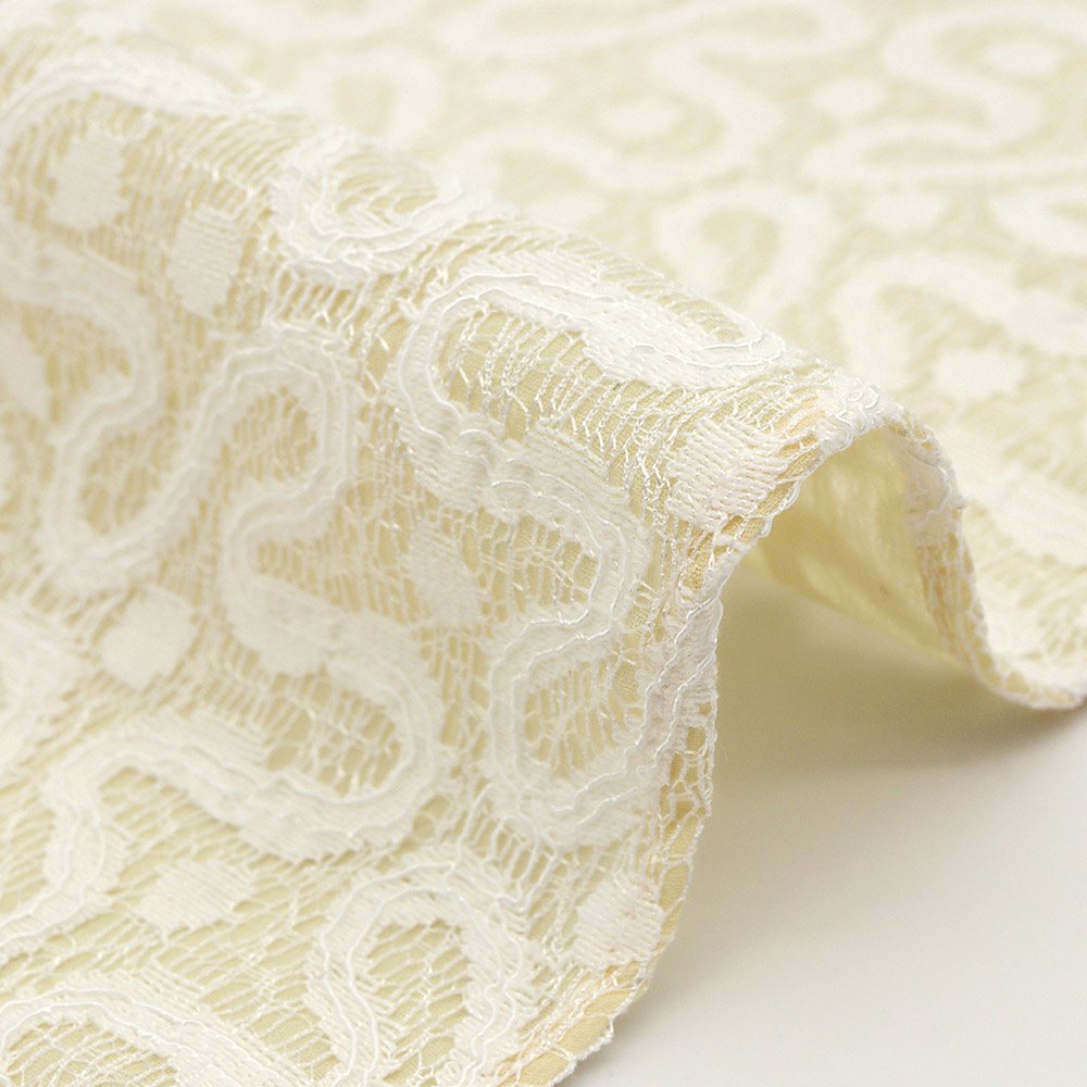 表にはジオメトリー柄のレース生地、裏にはイエローのシフォン生地をチョイスし、ボンディング加工を施した一枚です。