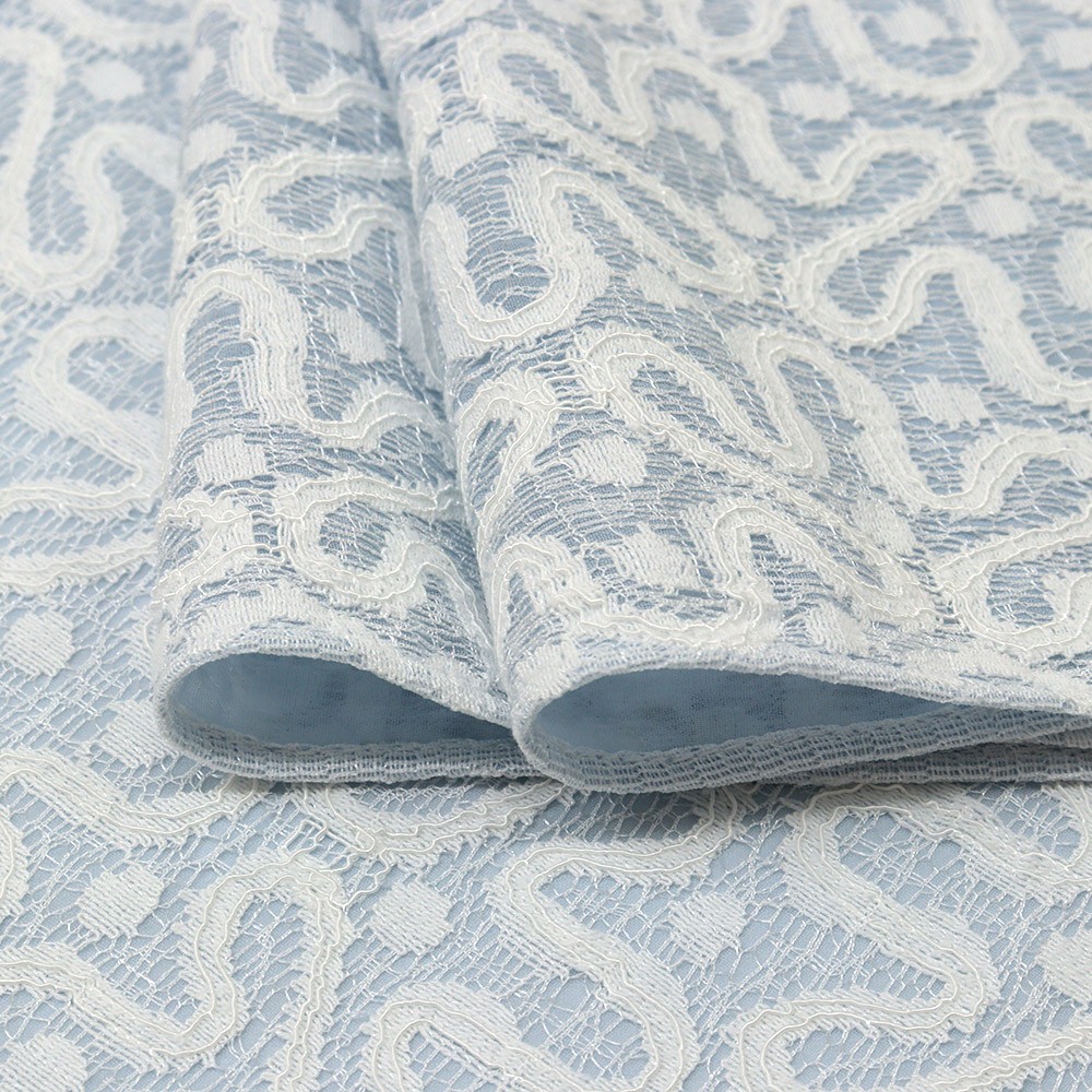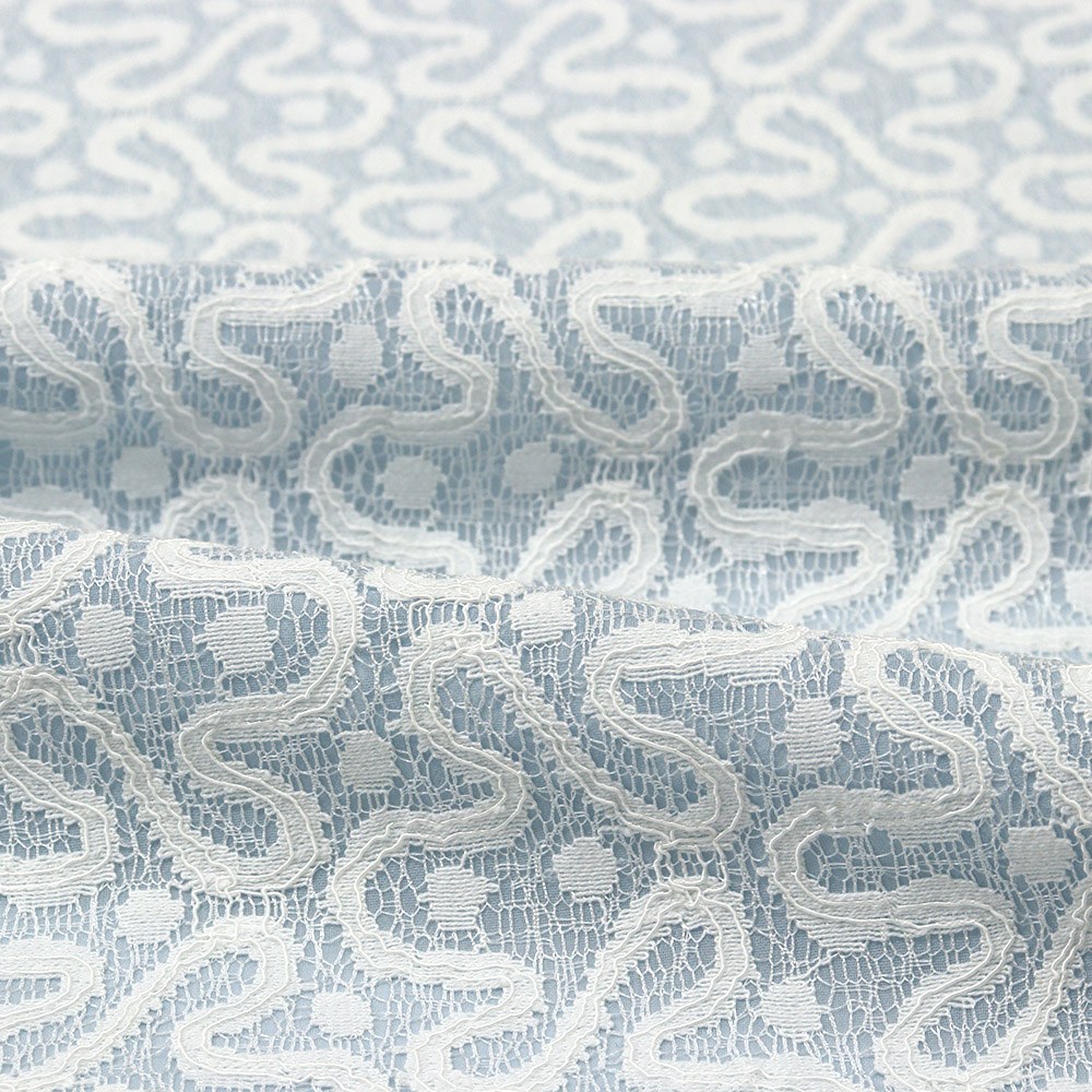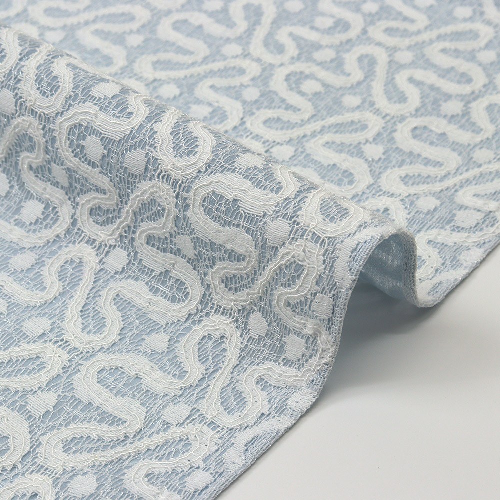 表にはジオメトリー柄のレース生地、裏にはブルーのシフォン生地をチョイスし、ボンディング加工を施した一枚です。