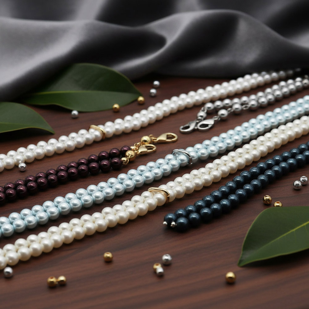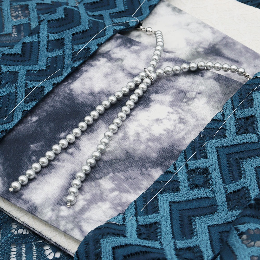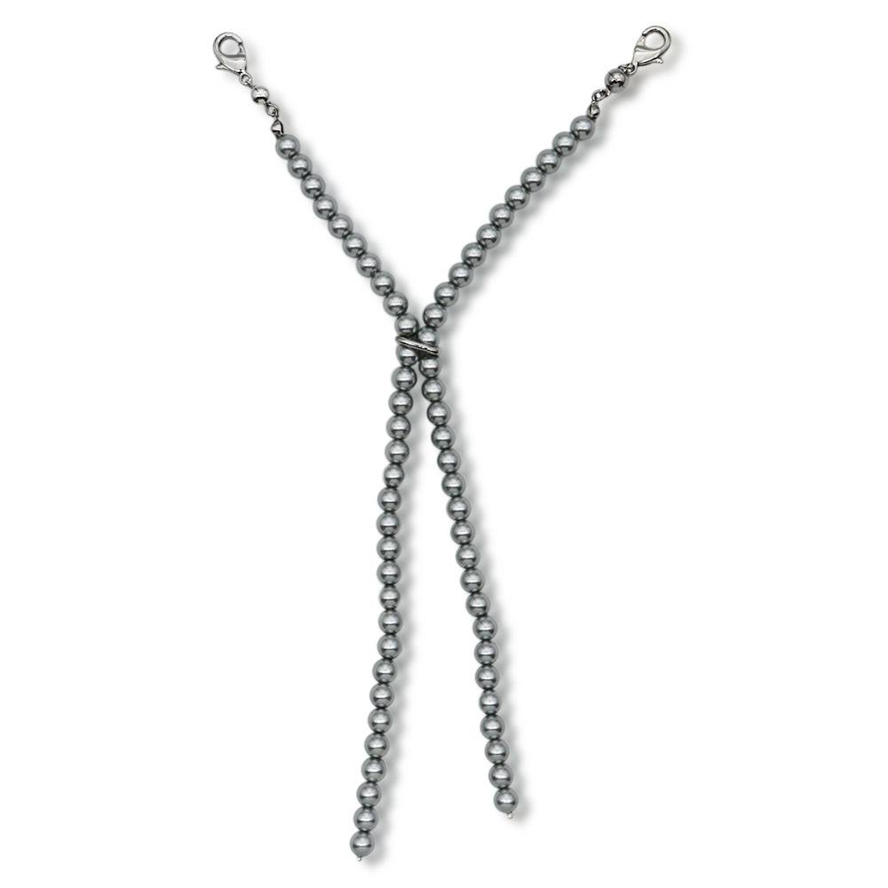 紐部分に樹脂パールを連ね、中心で束ねたネックレスのようなデザイン。豊かな色彩表現が魅力の樹脂パールで、よりカジュアルスタイルに合わせやすくなっています。