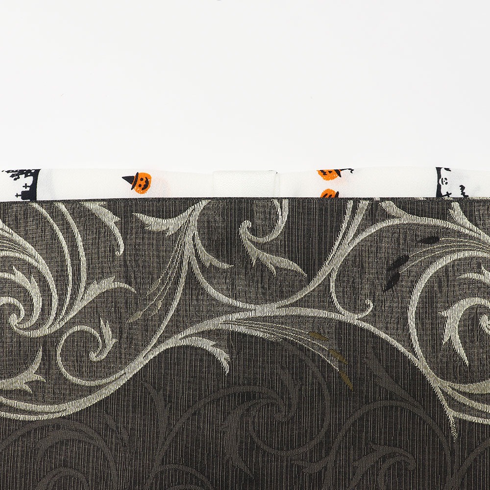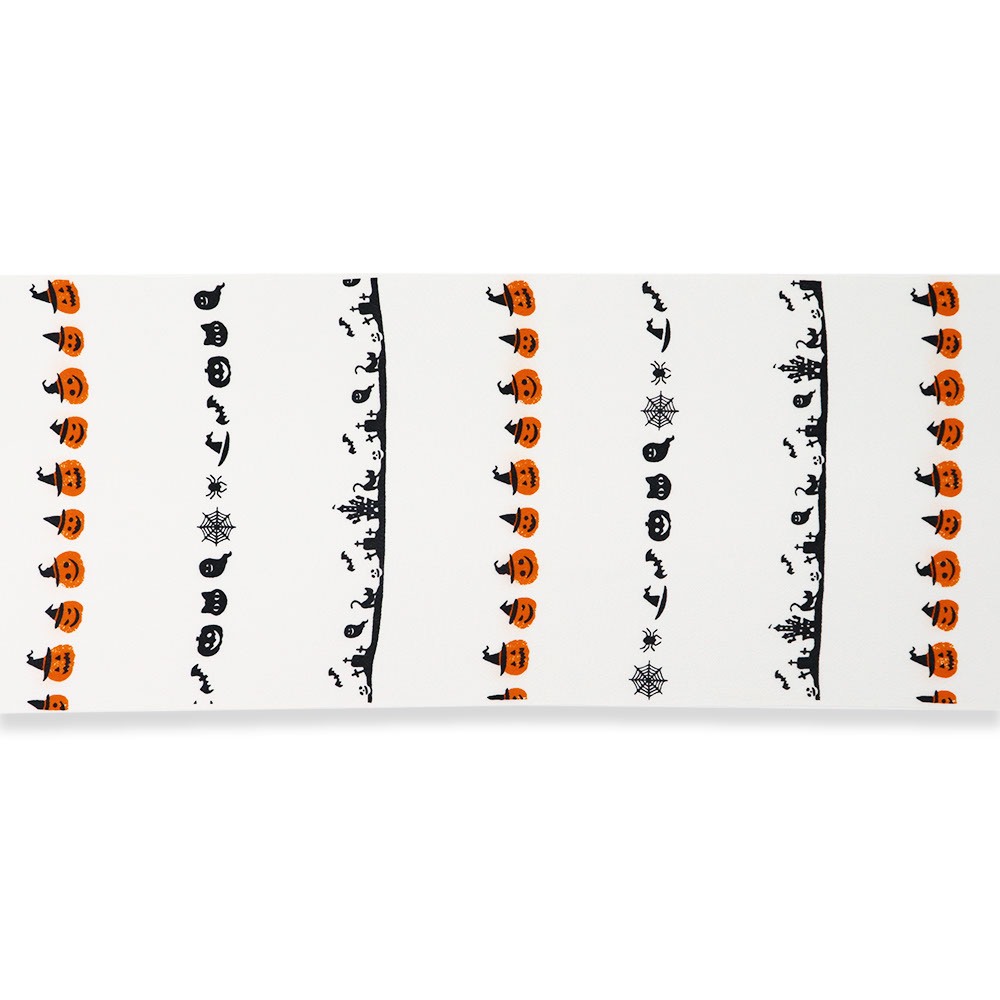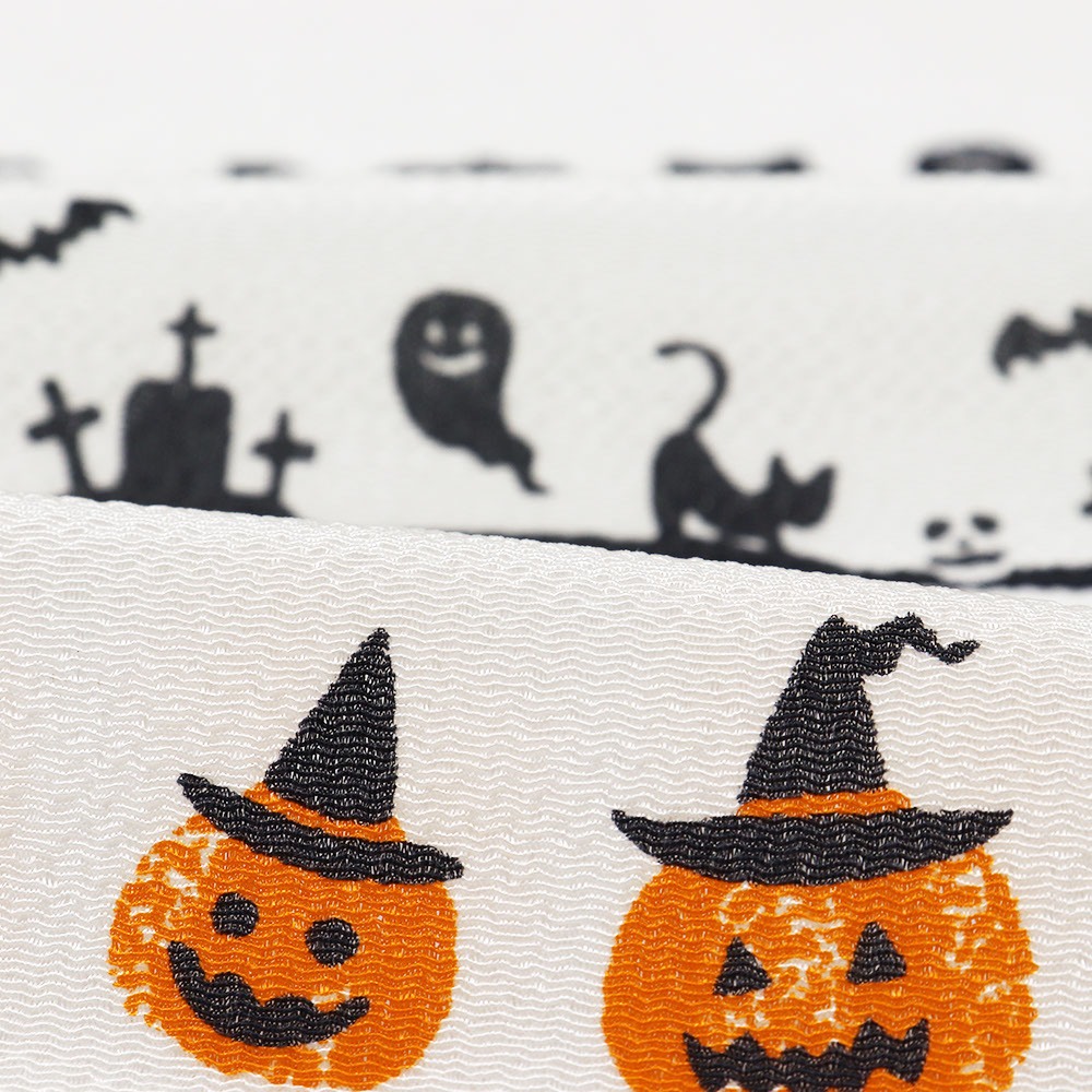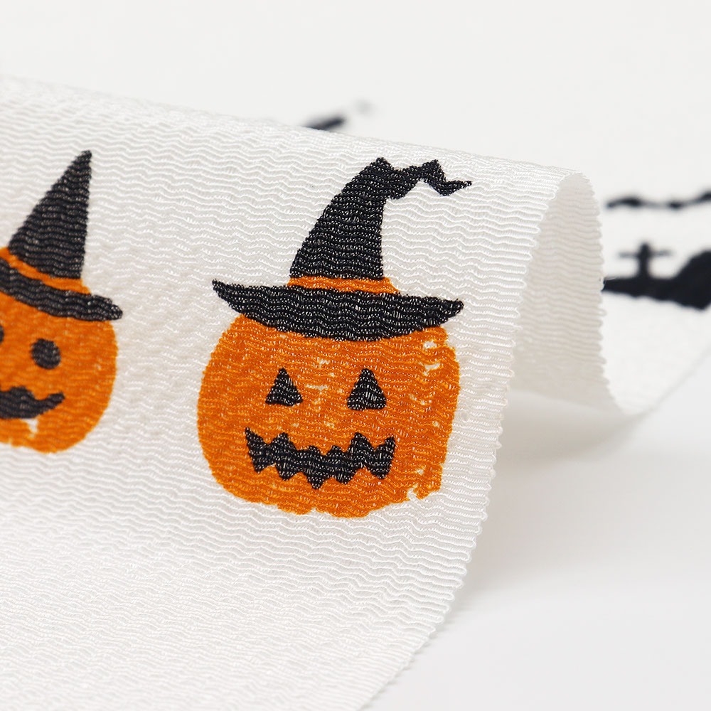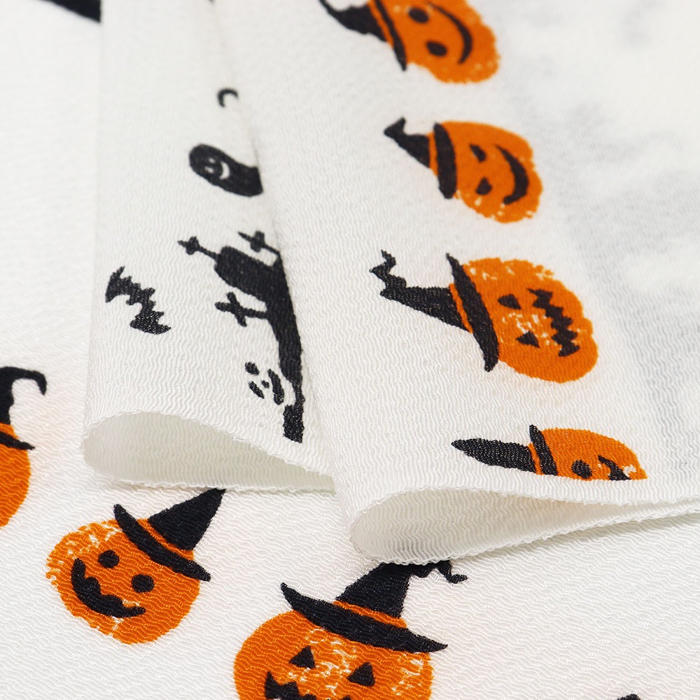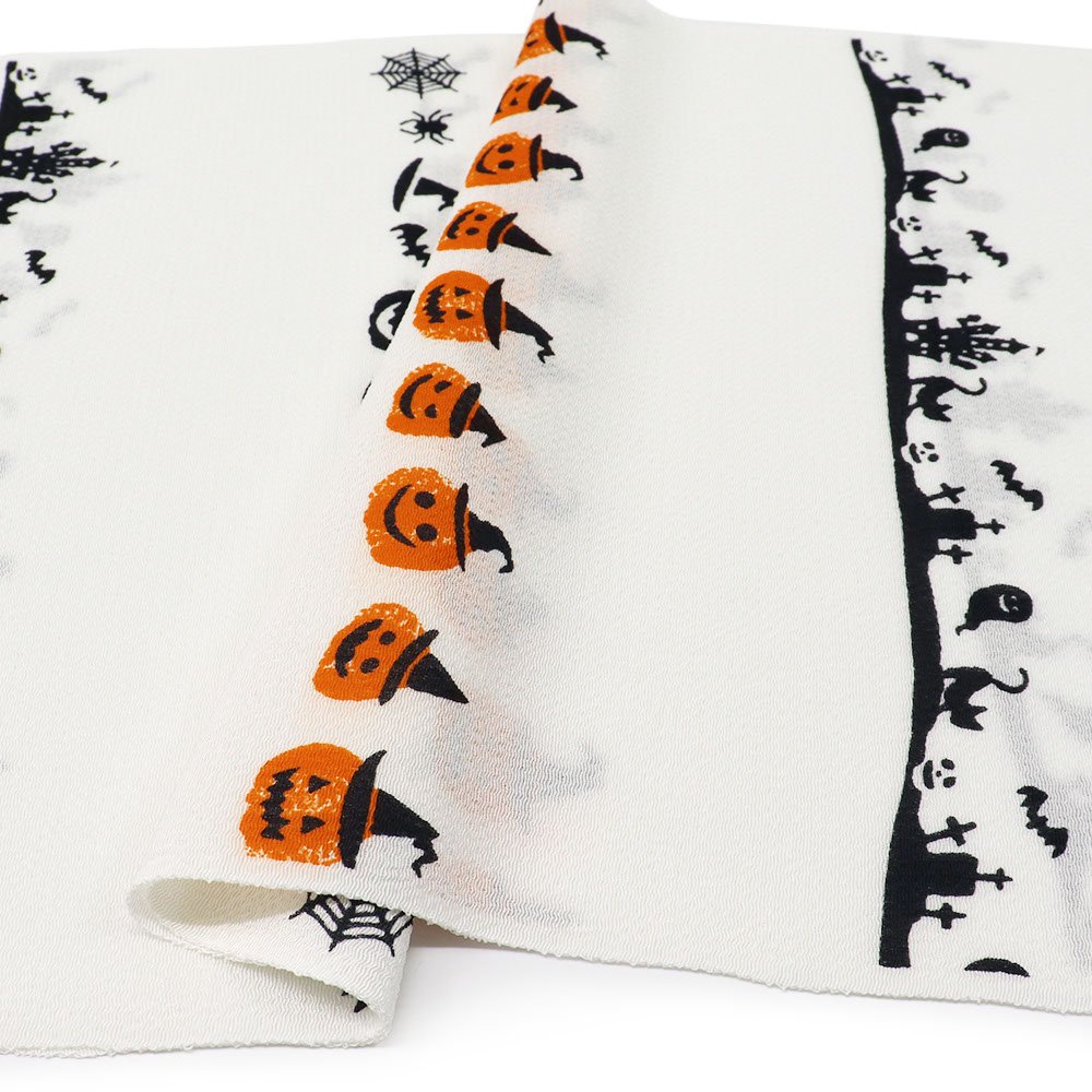ホワイトのちりめん地に、オレンジと黒でハロウィン柄を染めた一枚。