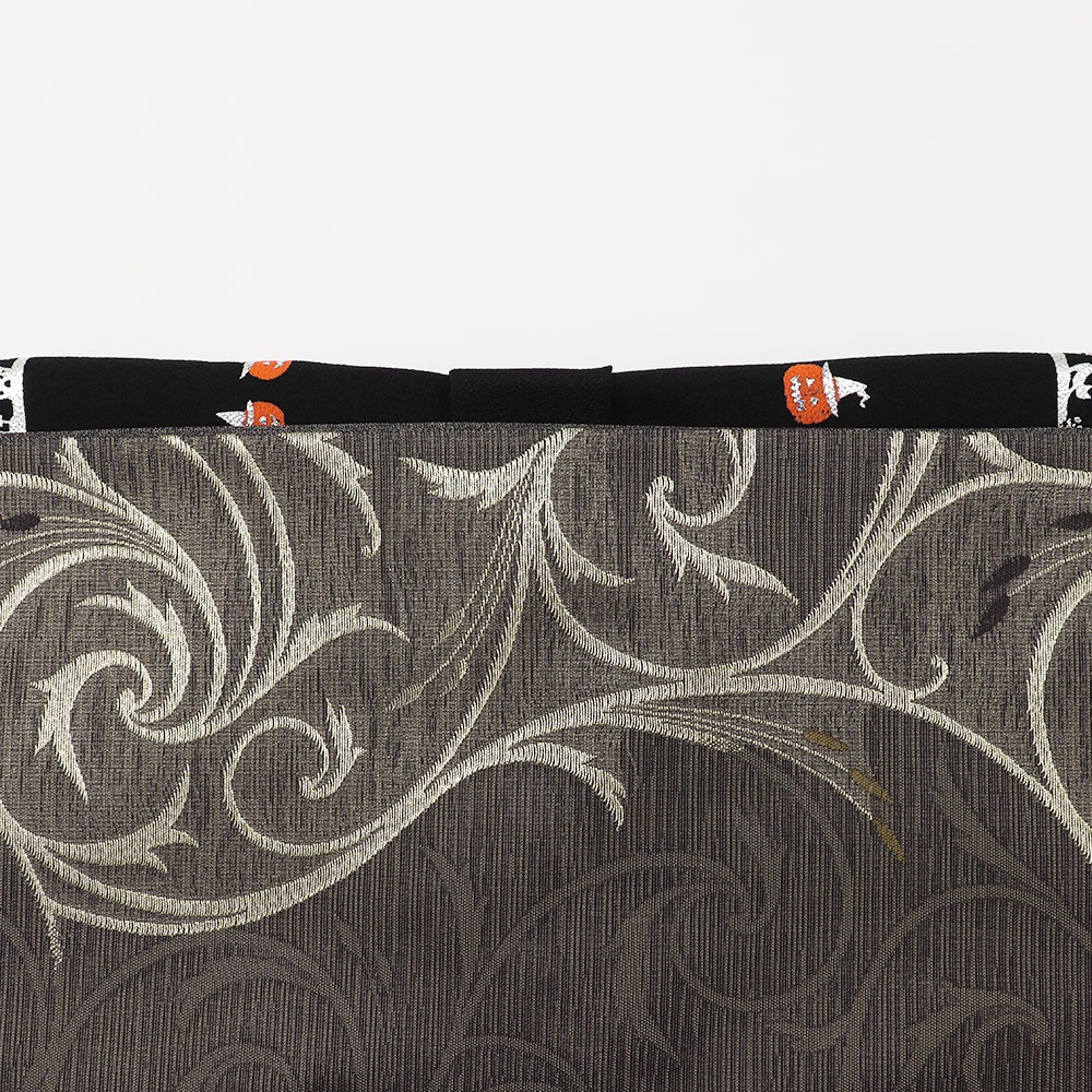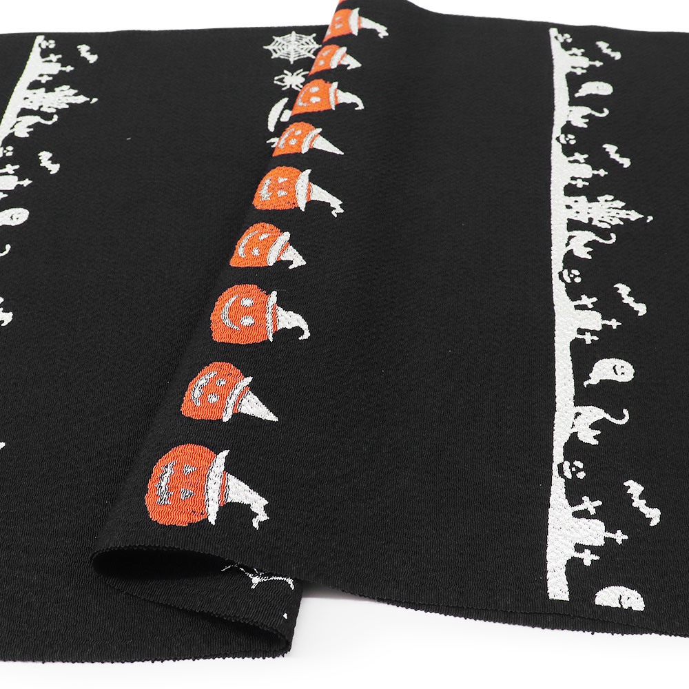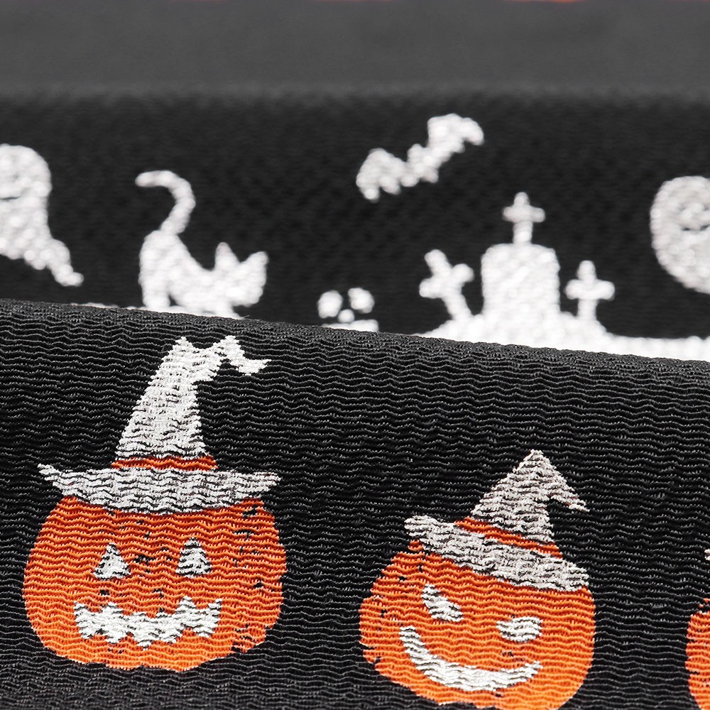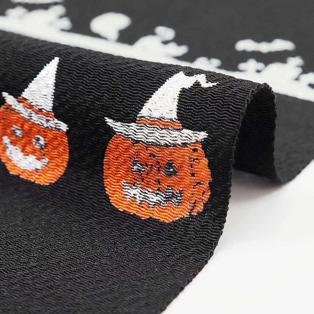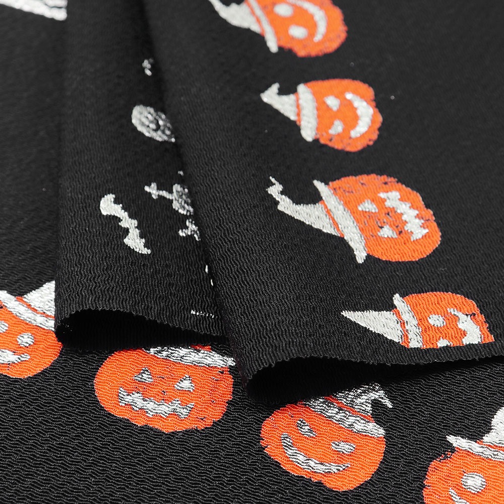 ブラックのちりめん地に、銀とオレンジでハロウィン柄を染めた一枚。