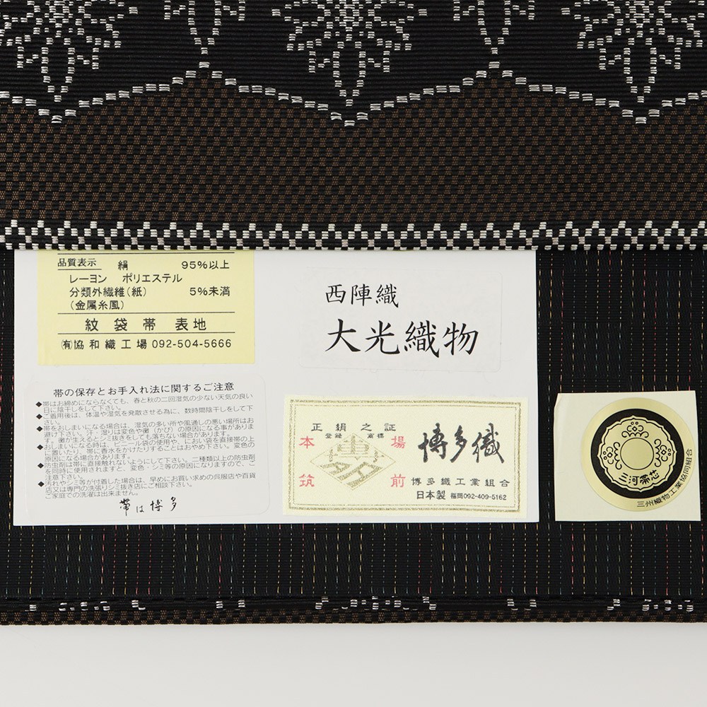 博多織工業組合「金証紙」付き【協和織工場】による、仕立て上がり博多袋帯。