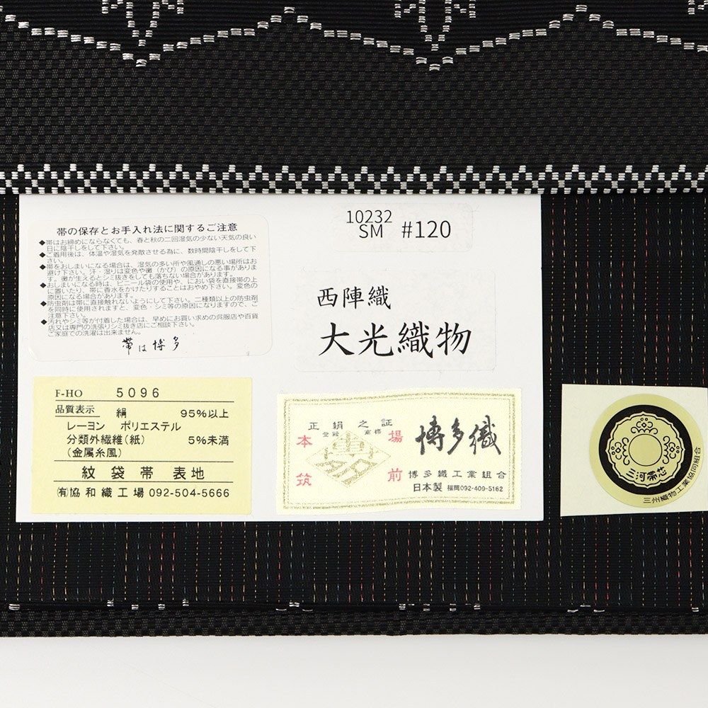 博多織工業組合「金証紙」付き【協和織工場】による、仕立て上がり博多袋帯。