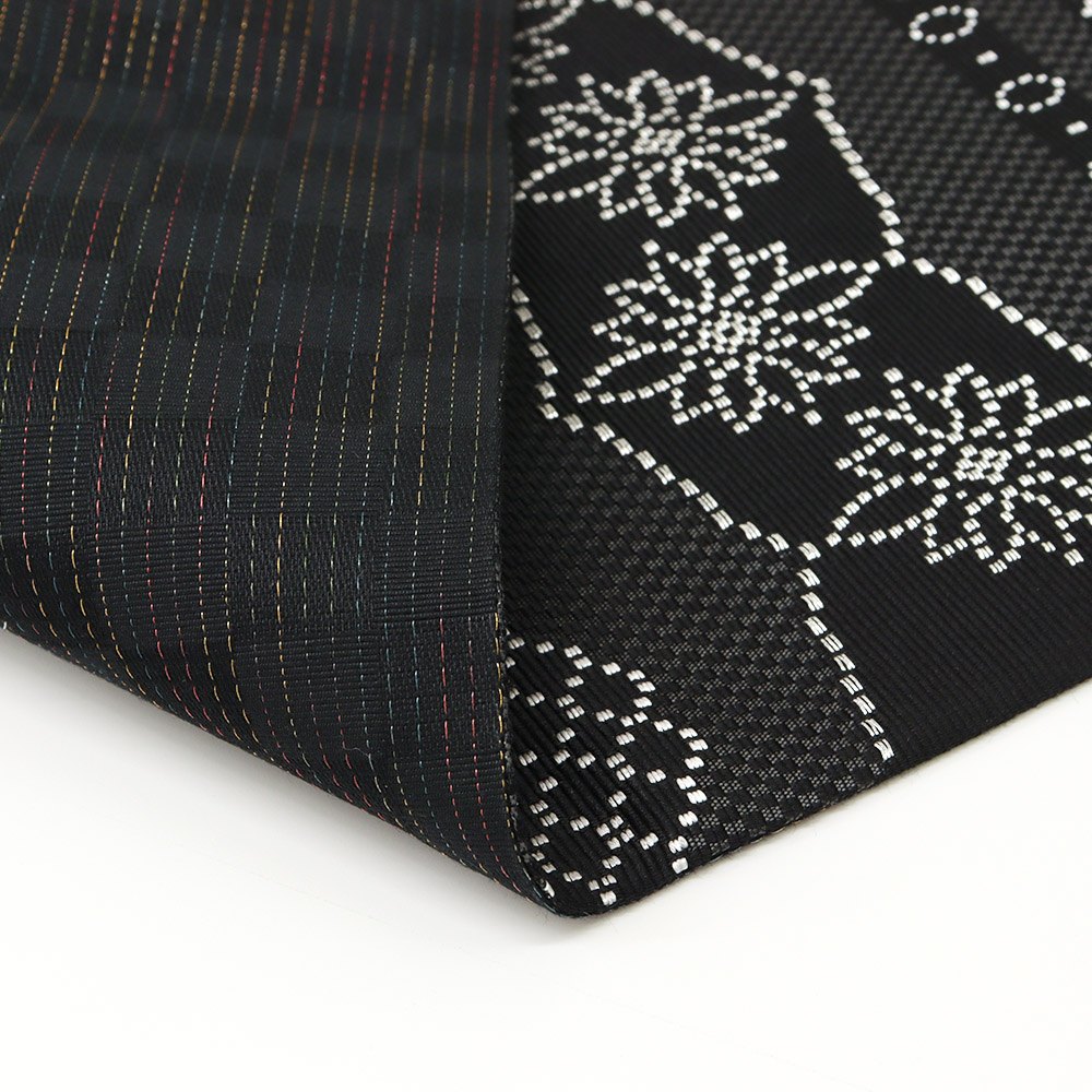 帯裏には、西陣の織元【大光織物】による、市松地紋に縞柄の織地を合わせた贅沢な一本です。