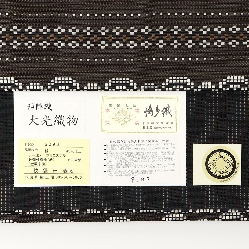 博多織工業組合「金証紙」付き【協和織工場】による、仕立て上がり博多袋帯。