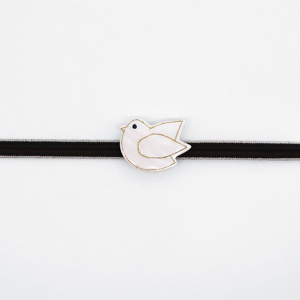 さまざまな色合いに輝く色彩は神秘的でありながら、丸っこいハトのフォルムが可愛らしく、帯元にそっとなじむような優しい仕上がりに。
