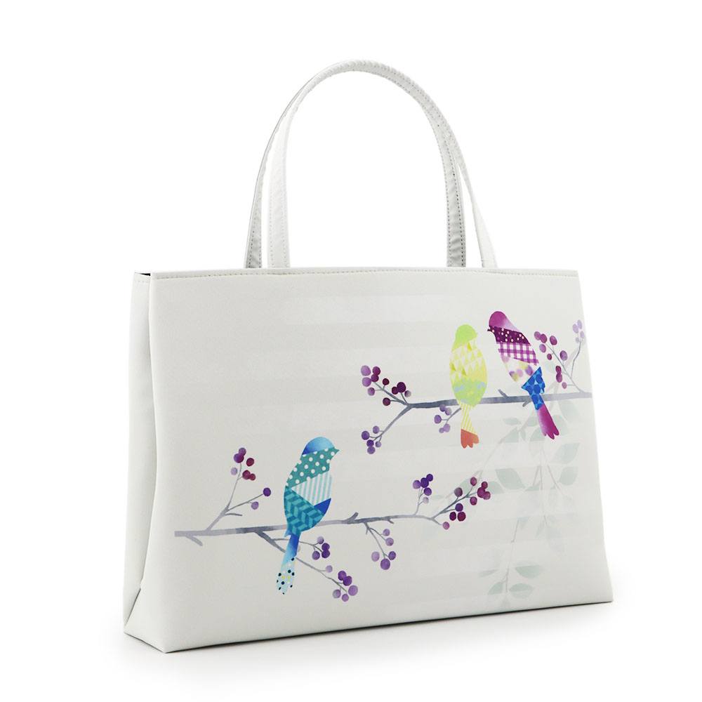 塩瀬のようなサラリとしたポリエステル地に、パッチワークのようなカラフルな小鳥を染めたひと品。