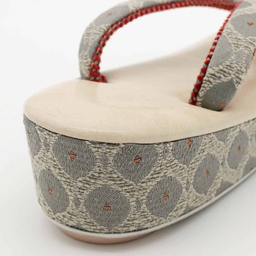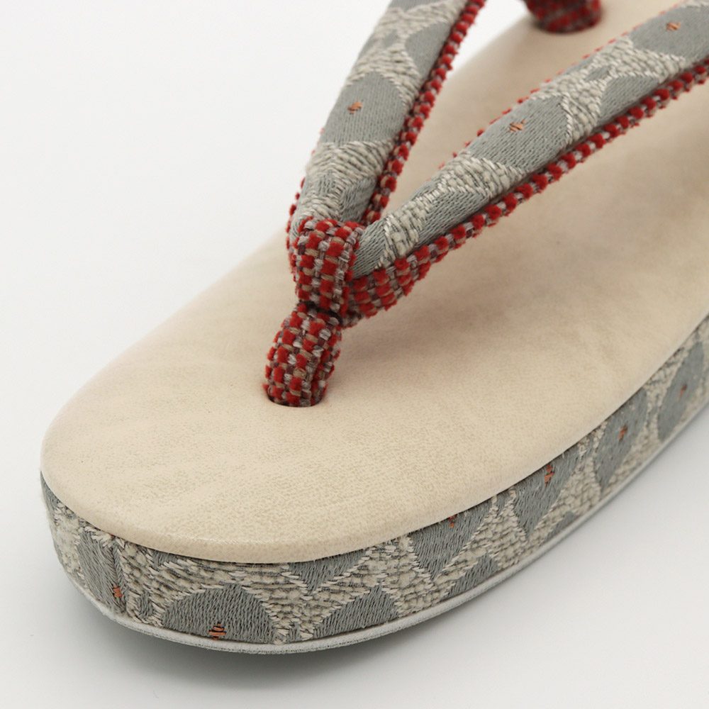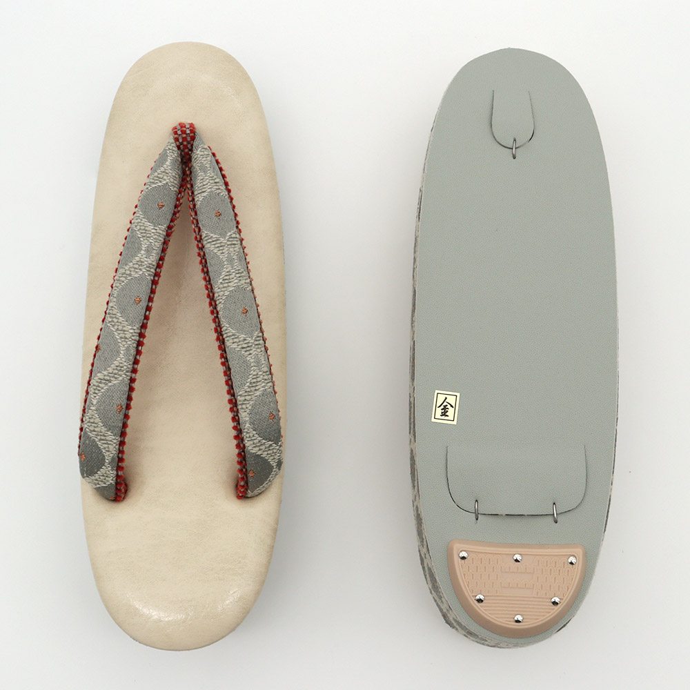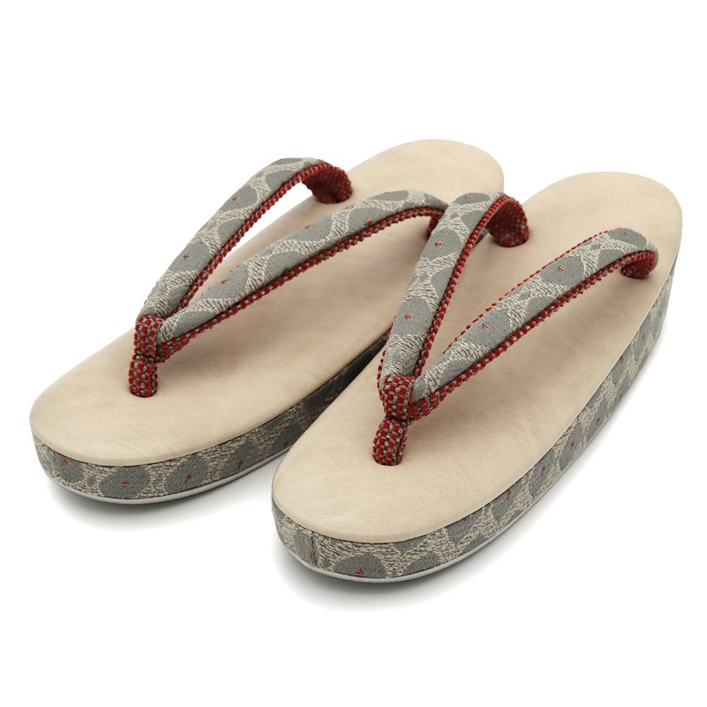 ベージュの草履天に、ふわりと毛羽立った丸紋柄の鼻緒を合わせた、シックな仕上がりになりました。