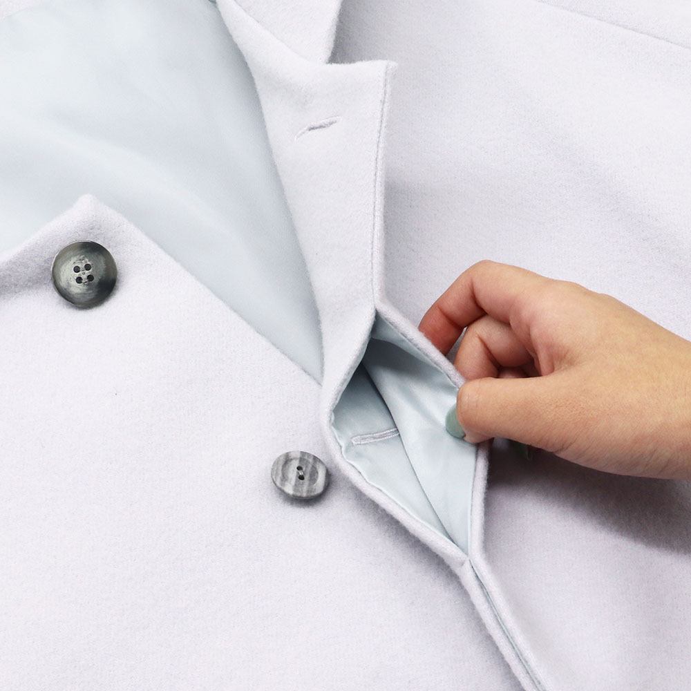 プチショールカラーは、エレガントなスタイルをカジュアルに楽しんでいただけるデザイン。比翼仕立てなので、首元のボタンの下に隠れたボタンで前をしっかり留めることができます。