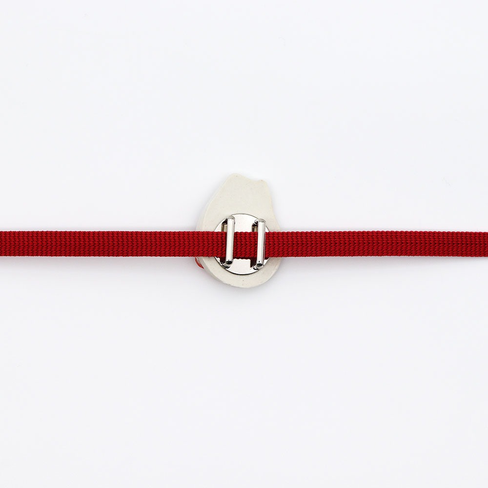 黒いたてがみを持つ白馬に赤梅を添えた帯留。こちらは赤梅に金の縁取りを施していないシンプルデザインです。