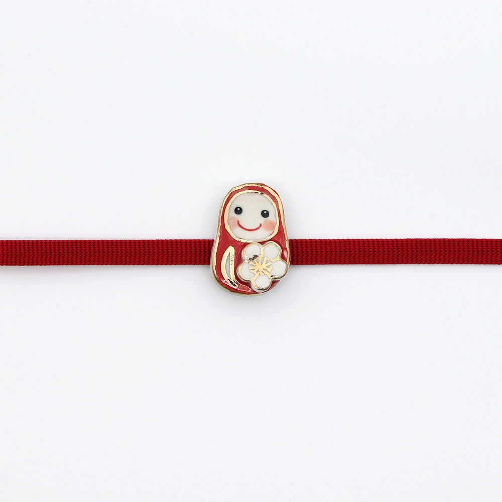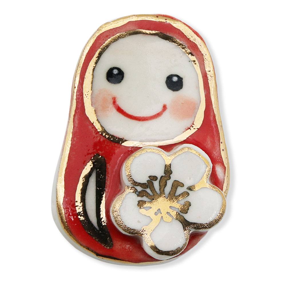 愛嬌のある顔をしただるまに、白梅を添えた可愛らしい帯留。商売繁盛や開運の縁起物としてつかわれるだるまは、お正月はもちろん、オールシーズンの祝いの席にピッタリ。