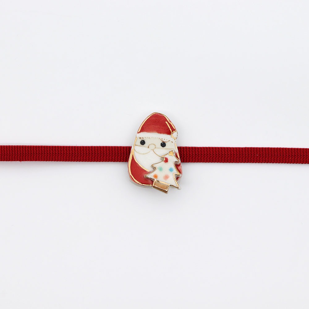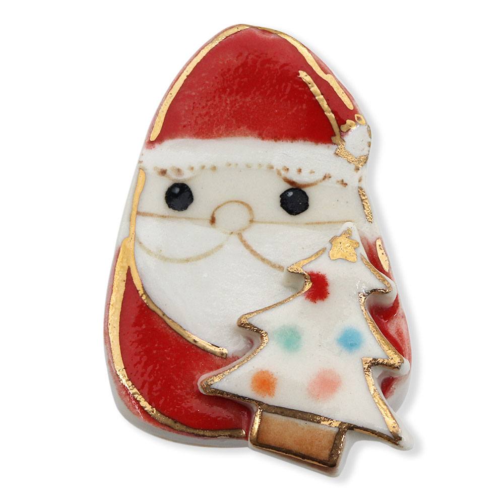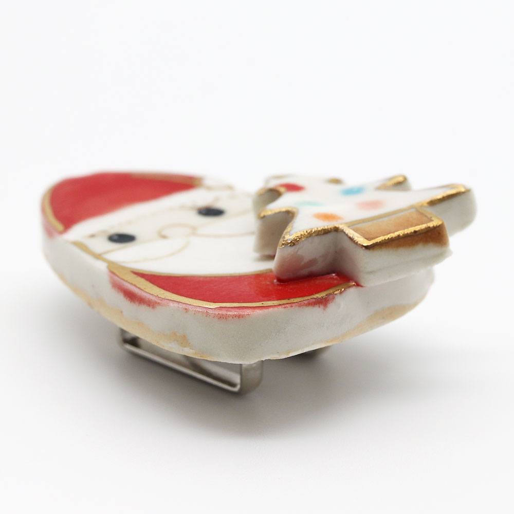 白ひげの丸っこいサンタさんが可愛らしい帯留。小さなツリーに金彩の縁取りも、クリスマス気分たっぷりです♪
