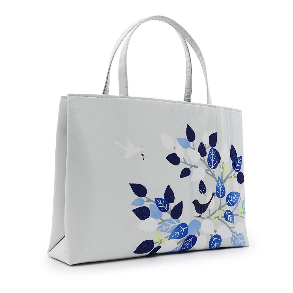 塩瀬のようなサラリとしたポリエステル地に、葉と小鳥のシルエットを配した北欧風のひと品。