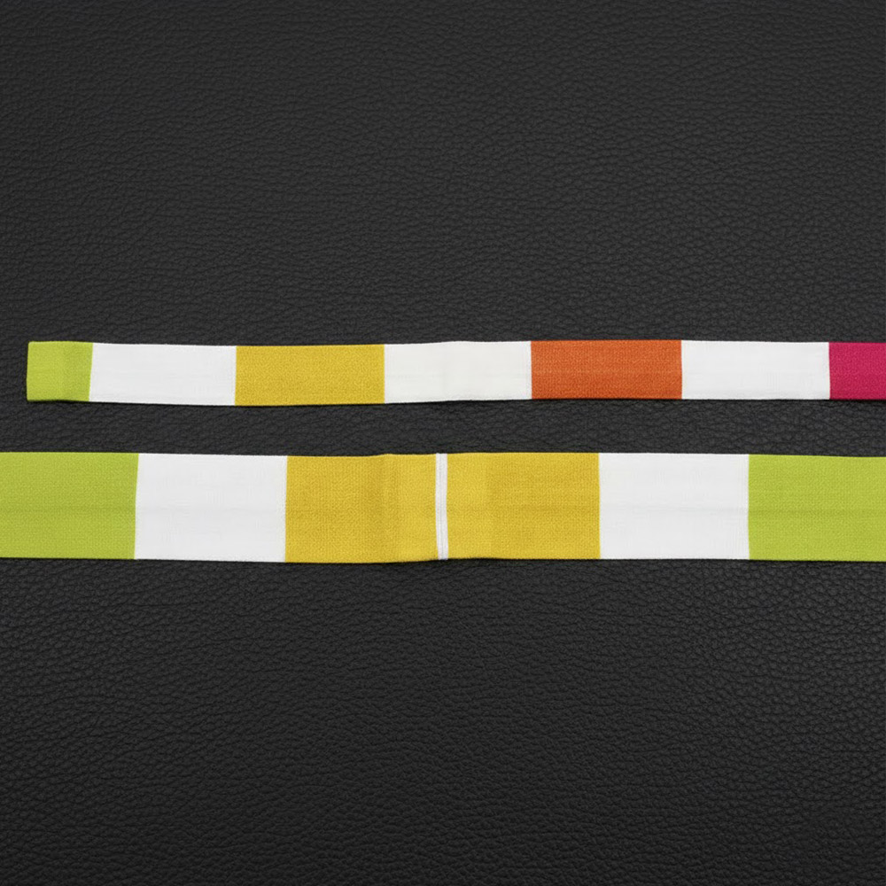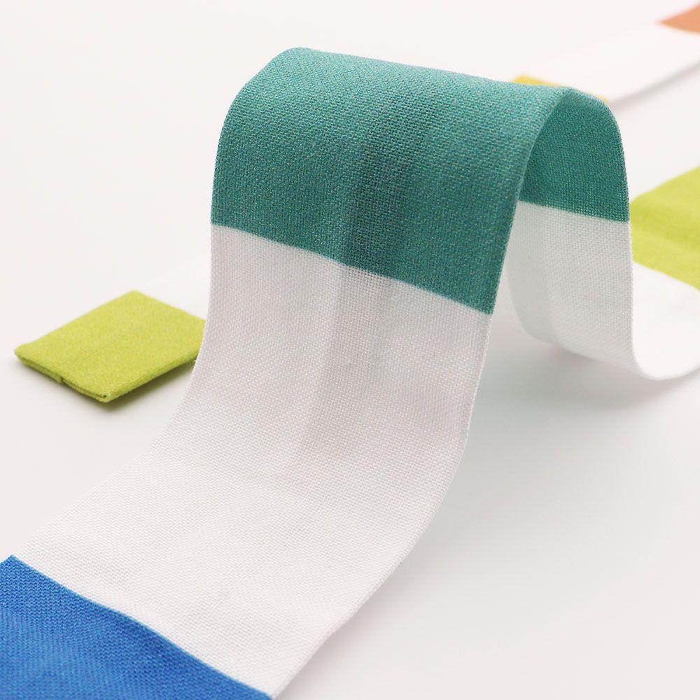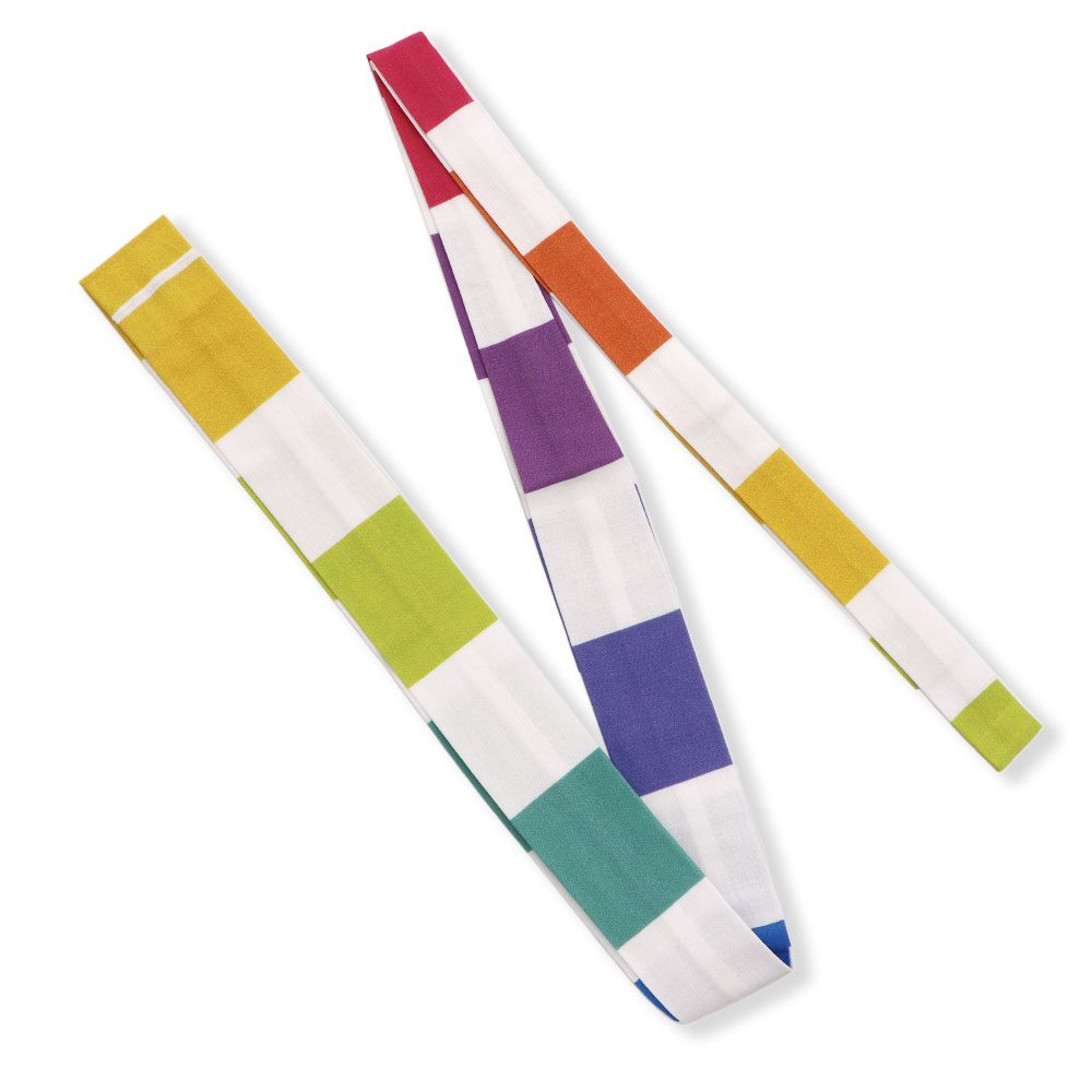 七色のカラーブロックを等間隔に配置したデザインは、腰紐の中心から左右対称に同じカラーが置いてあるので、腰紐の中心が視覚的にすぐわかるように。腰紐を結ぶ際には、カラーブロックを見ながらバランスよく結ぶことができているか簡単に確認することができます。
