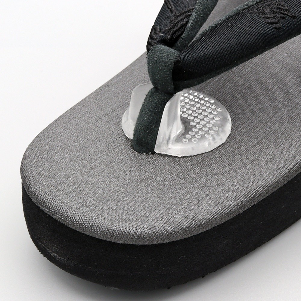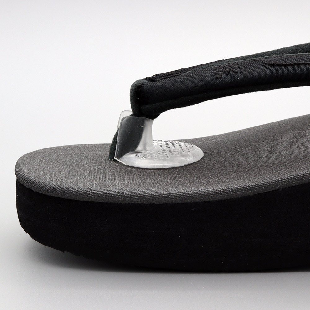 鼻緒を挟むスリットが付いており、これがクッション替わりとなって指間のスレを防止します。