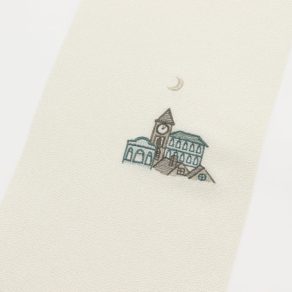 真夜中の、大きな時計塔のある街並みを刺繍したシックな一枚。彩度を抑えた刺繍糸を合わせることで、主張しすぎず、上品な雰囲気に仕上がりました。