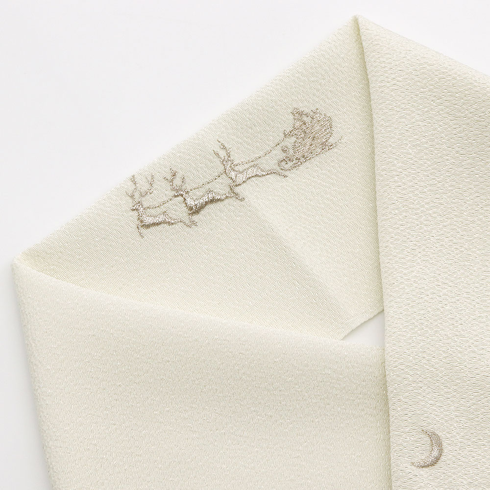 衣紋には、トナカイが引くそりに乗ったサンタさんを刺繍。真夜中にきらめくサンタさんと月を、きらめく箔糸で表現し、さりげなく衿元を飾ります。