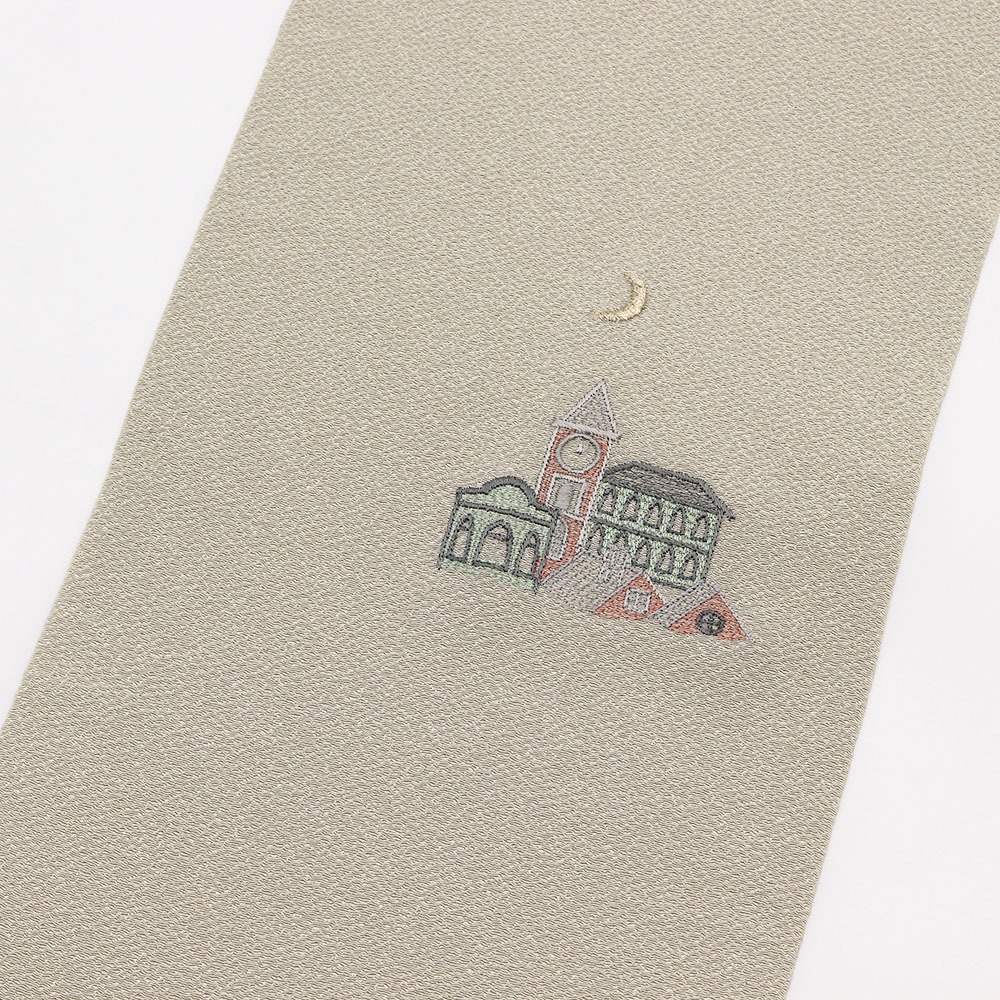 真夜中の、大きな時計塔のある街並みを刺繍したシックな一枚。彩度を抑えた刺繍糸を合わせることで、主張しすぎず、上品な雰囲気に仕上がりました。