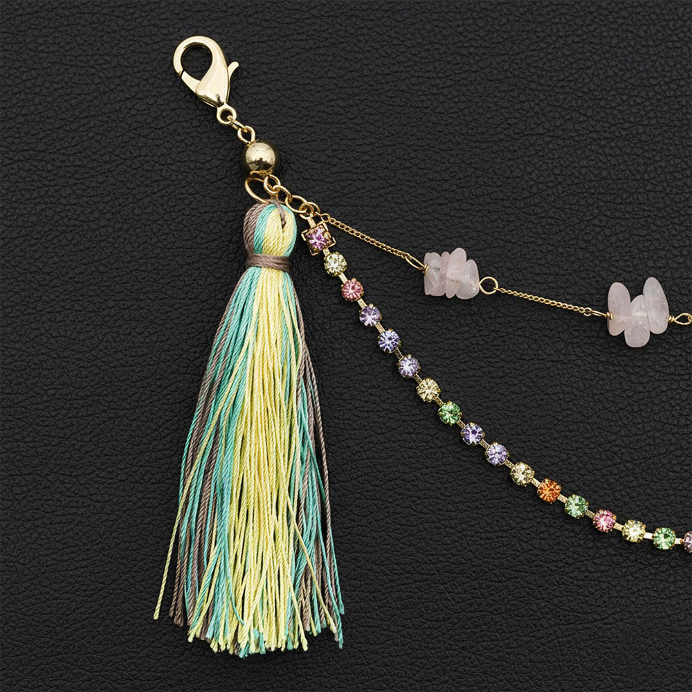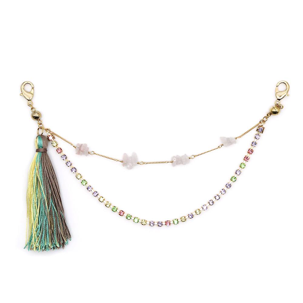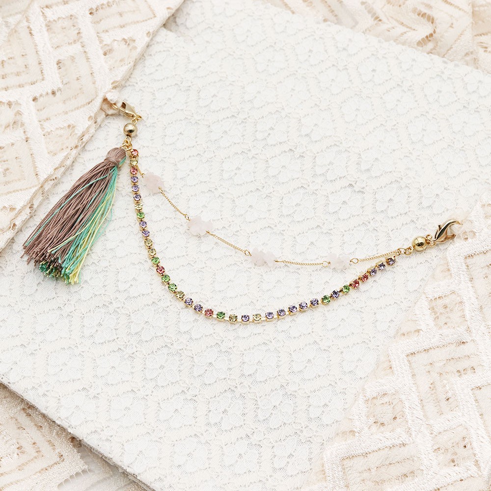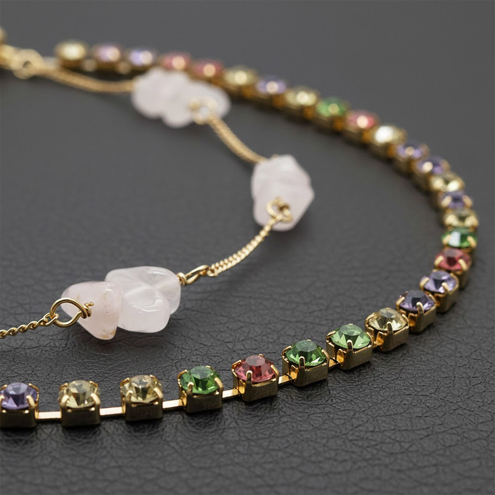 ローズクォーツを並べたチェーンと、ピンクやグリーンのガラスを並べたチェーンを使用したきらめき感のあるデザイン。ジュエリーの重ね付けのような感覚で着用できるようになっています。