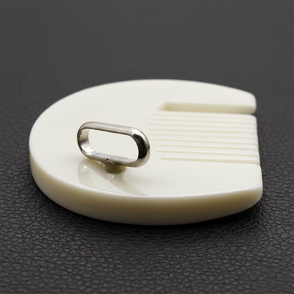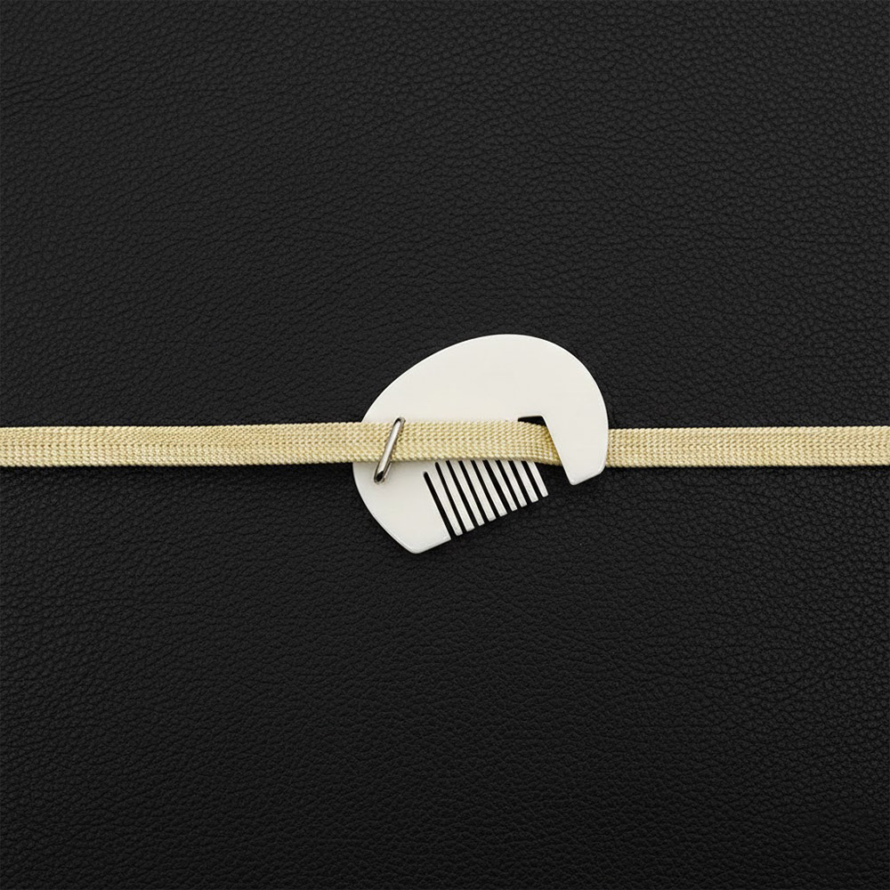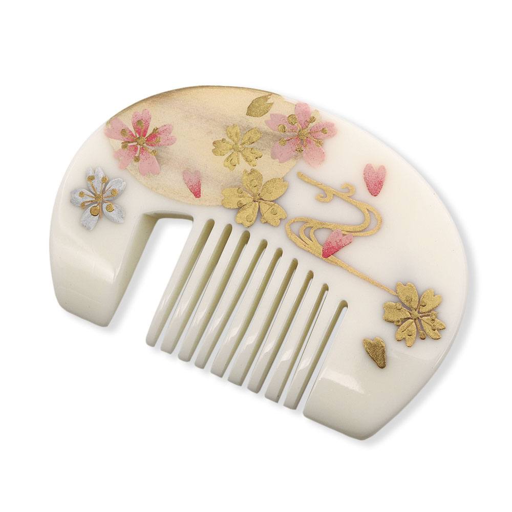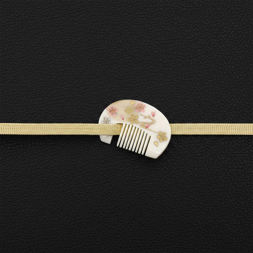桜が描かれた櫛を帯留にしたデザイン。櫛の歯に大きく空いた隙間から帯締をくぐらせることで、櫛を帯締に引掛けているような着け方になります。