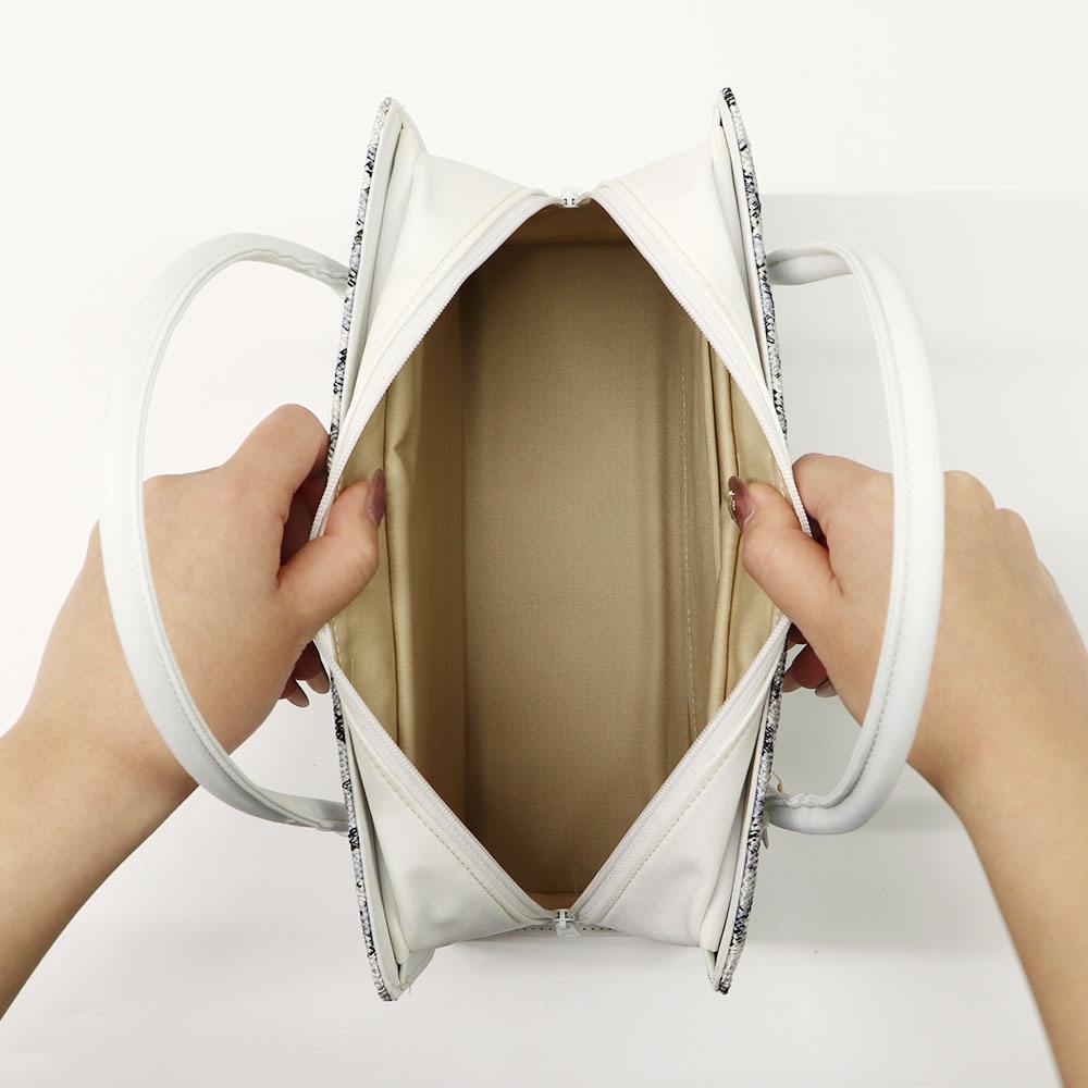 もともとお茶席用だった利休バッグはその便利さから普段使いにも使用されるように。使いやすい形と大きさに加えて、ダブルファスナーで開閉しやすく、外側両サイドと内側にはポケットを備えています。底鋲が4つ打ってあるので畳や床に置いたときにも美しく収まります。