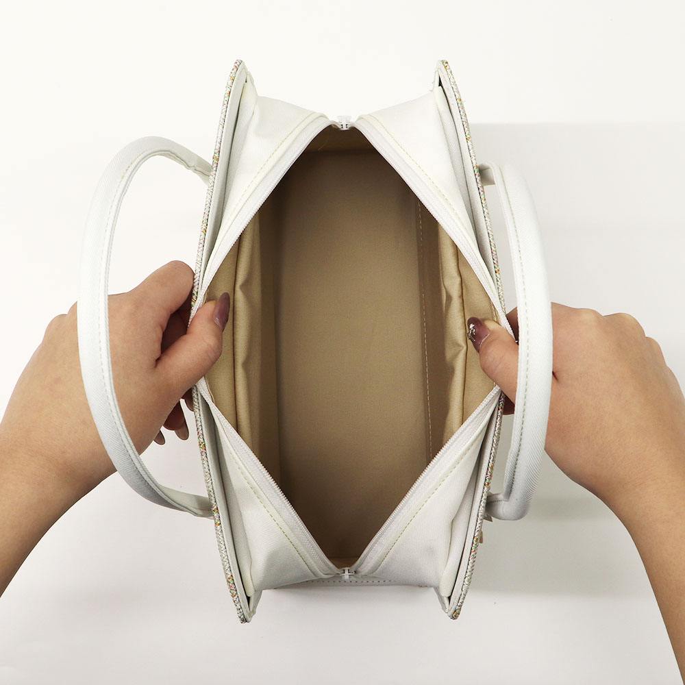 もともとお茶席用だった利休バッグはその便利さから普段使いにも使用されるように。使いやすい形と大きさに加えて、ダブルファスナーで開閉しやすく、外側両サイドと内側にはポケットを備えています。底鋲が4つ打ってあるので畳や床に置いたときにも美しく収まります。