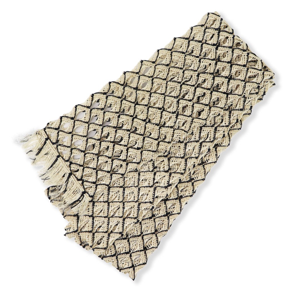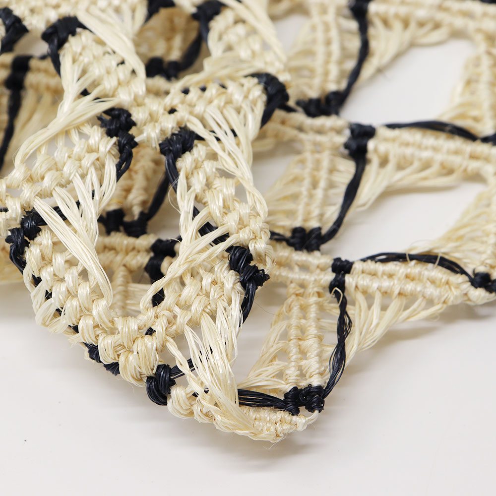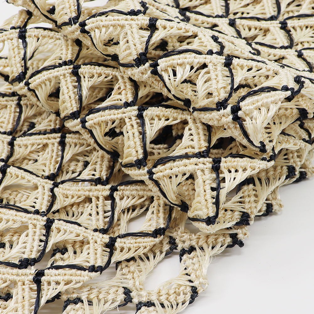 大きく透け感をとった角繋ぎの繊細な意匠が、バケーションスタイルにもシティライクにも似合う、トレンド感のあるコーディネートへ。墨色のラインが加わることで、キリリと粋な雰囲気も漂いますね。