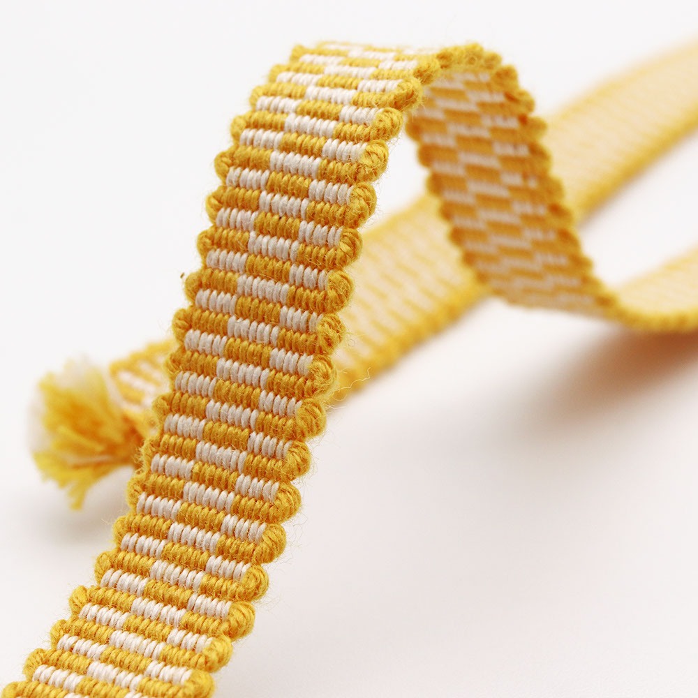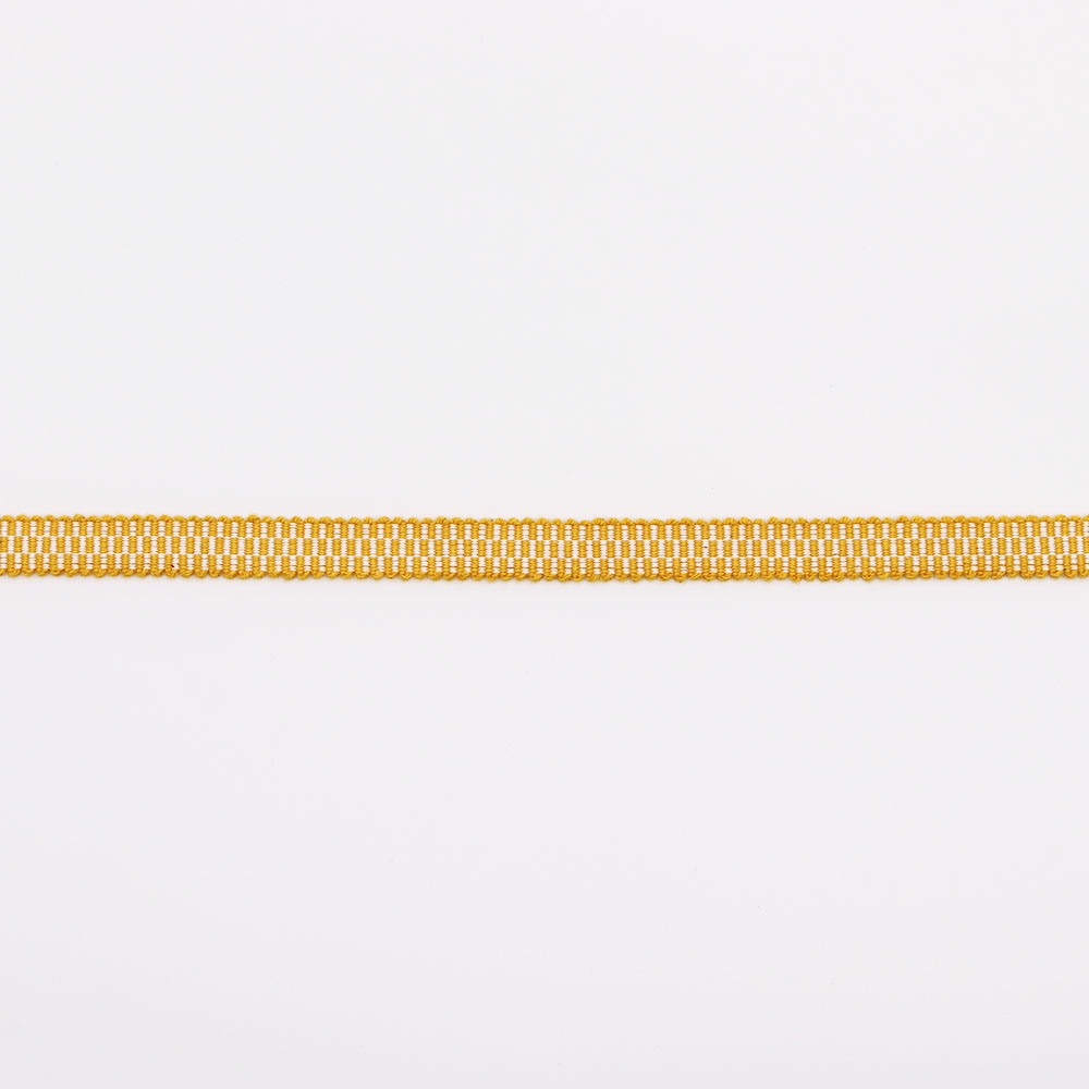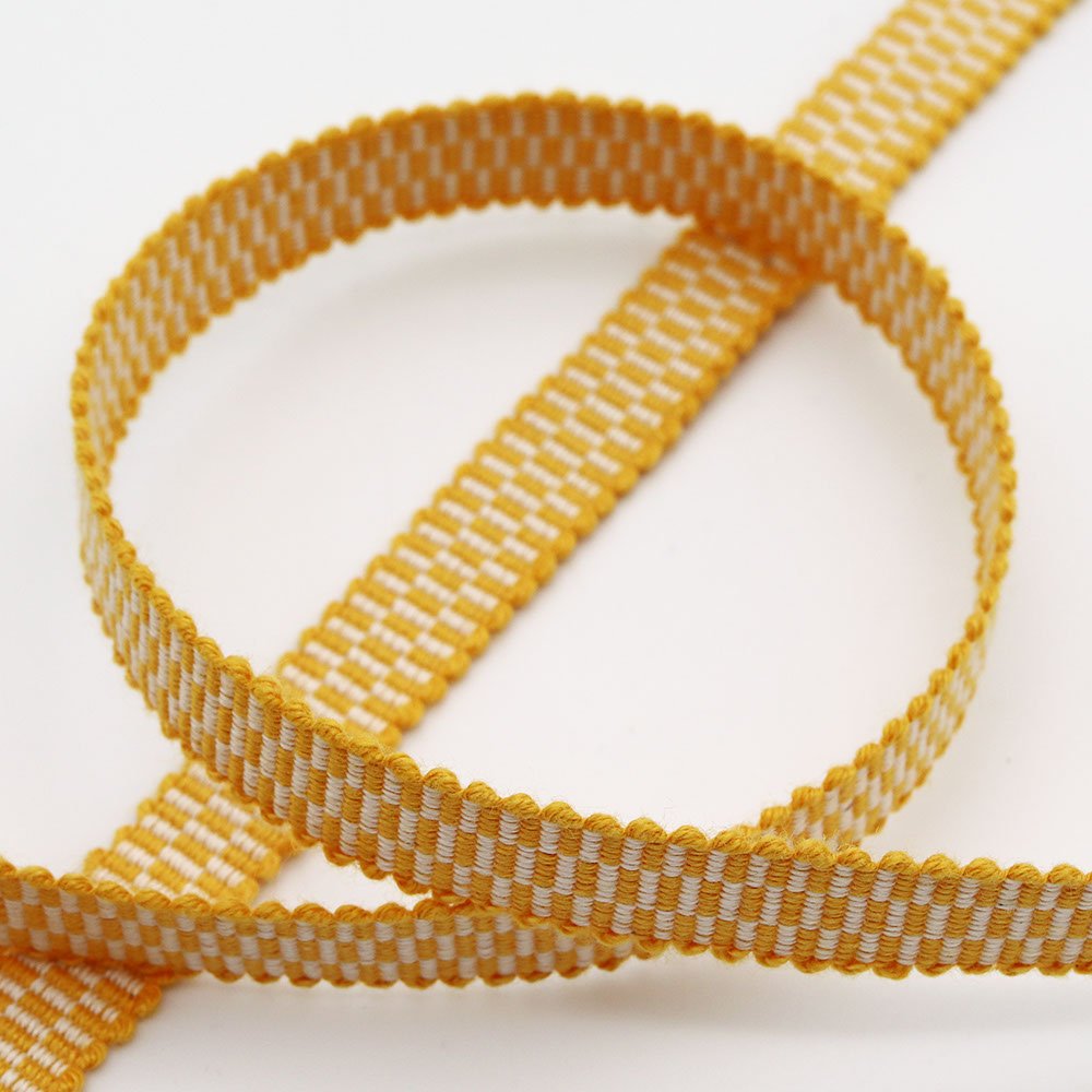 畳目に従って織り出された市松柄は、鮮やかな黄色が可愛らしい仕上がり。真田紐の特徴のひとつである平たい形状は、帯周りに隙間なくピッタリと寄り添うので、帯留や帯飾りを目立たせてくれそうです。