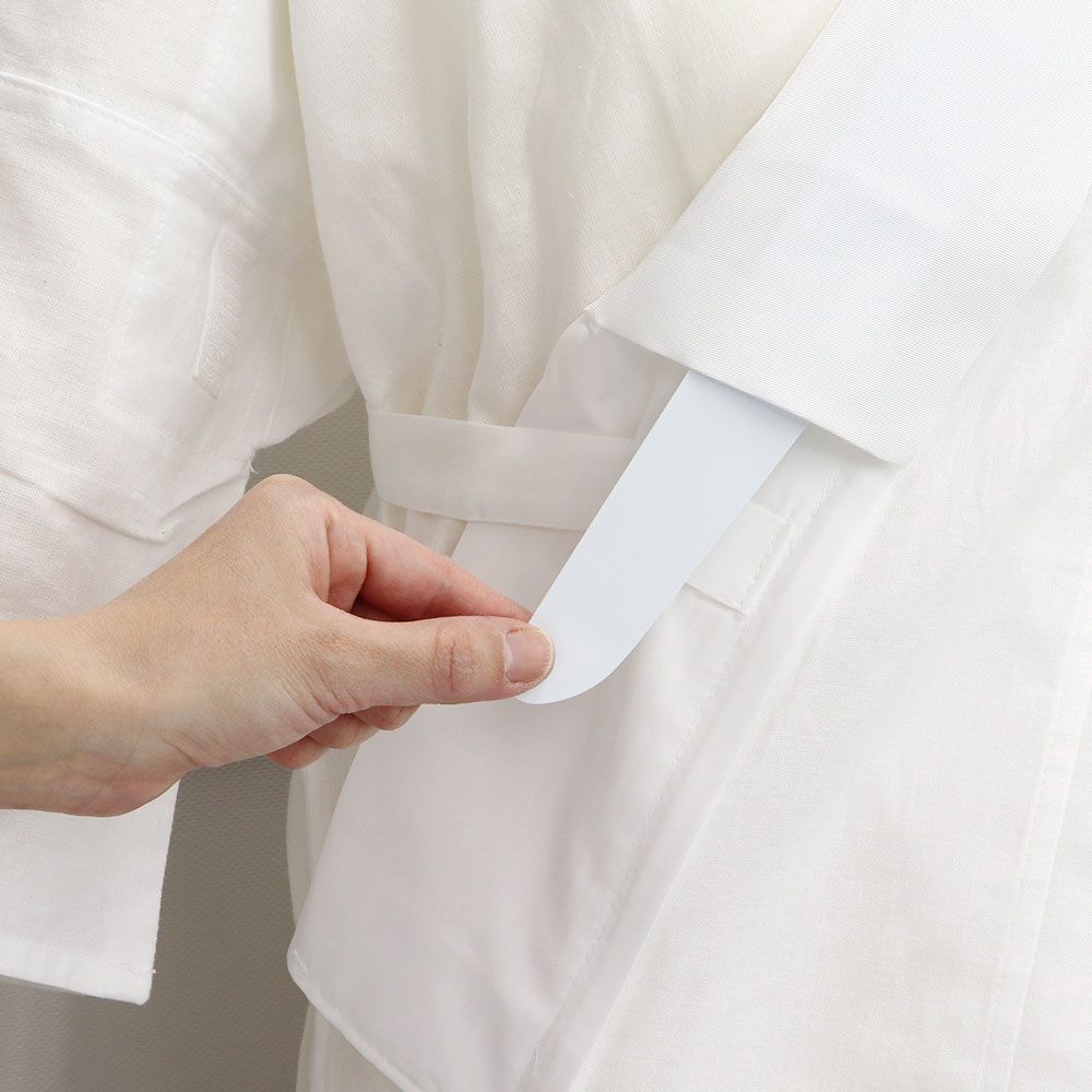 半月型の膨らんだ方をファスナー側に向け、半衿の端からこちらの衿芯を通すだけで、ピシッと真っ直ぐな衿元が完成。繰り返しの洗濯で衿がヨレてきたり、衿元をいつもより綺麗にしたい方にオススメです。2枚入りなのも便利で嬉しいですね◎