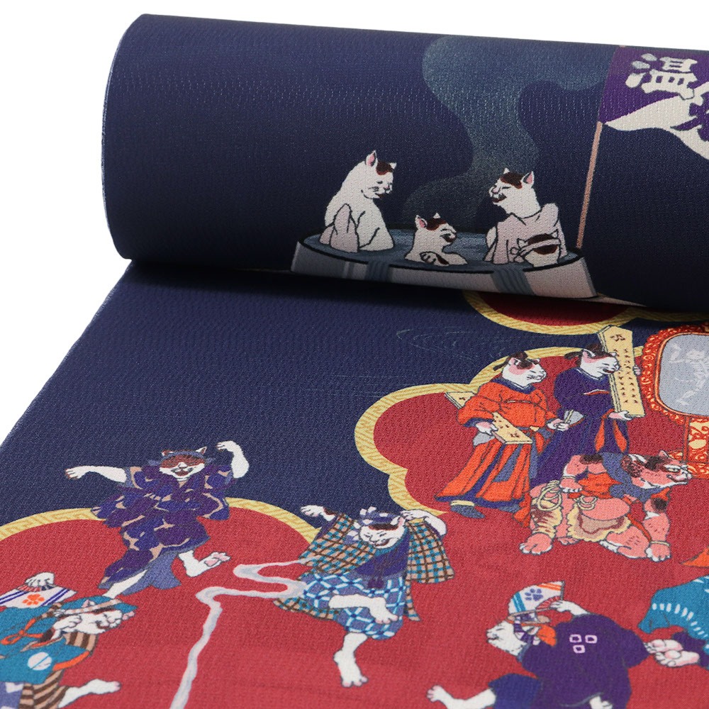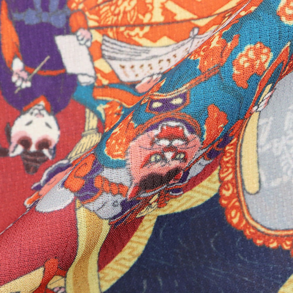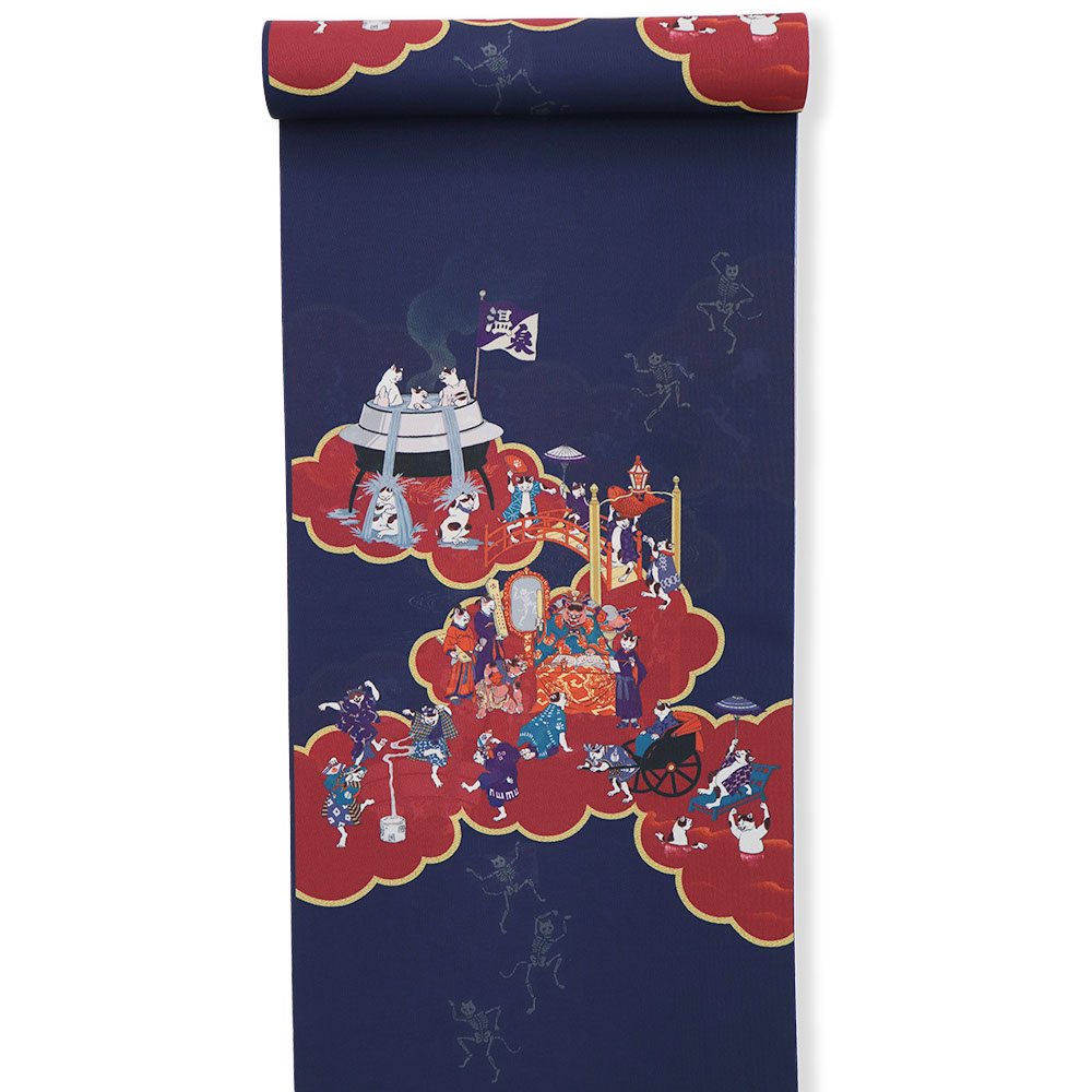 「獄極楽猫」と名付けられたこちらは、閻魔様に扮する猫をはじめ、地獄の様子をユーモラスに描いた一枚。可愛らしく個性的なデザインは、袖口等からチラリと覗いた時にも気分が上がりそうです。