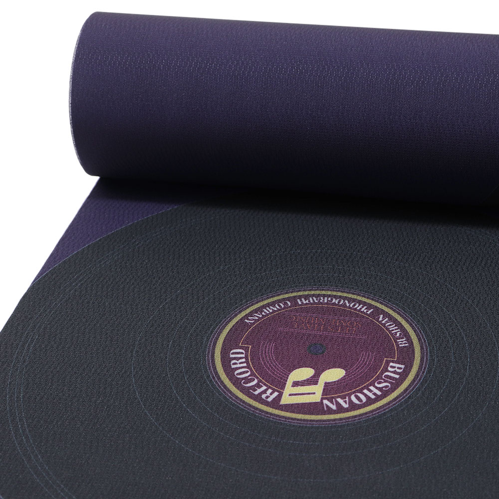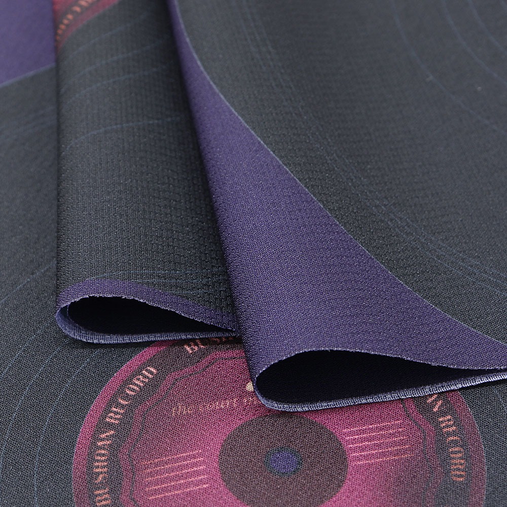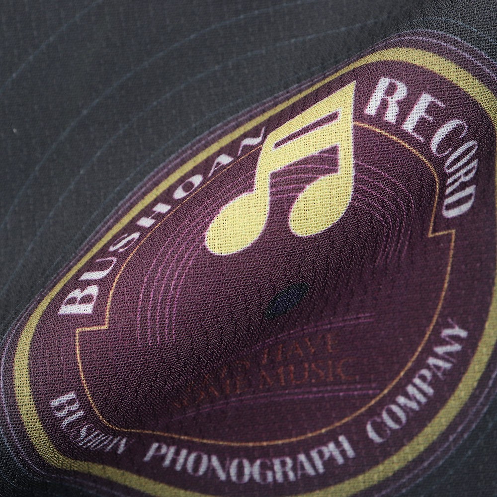 レコードを大胆に並べたレトロ感あふれる一枚です。黒で統一された柄行に対する地色の紫はシックなコントラストに。袖口等からチラリと覗いた時にも気分が上がりそうです。