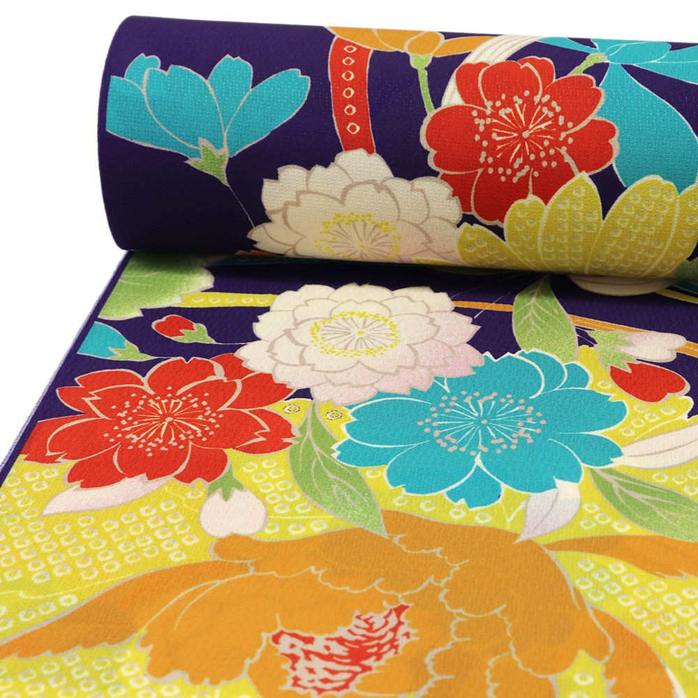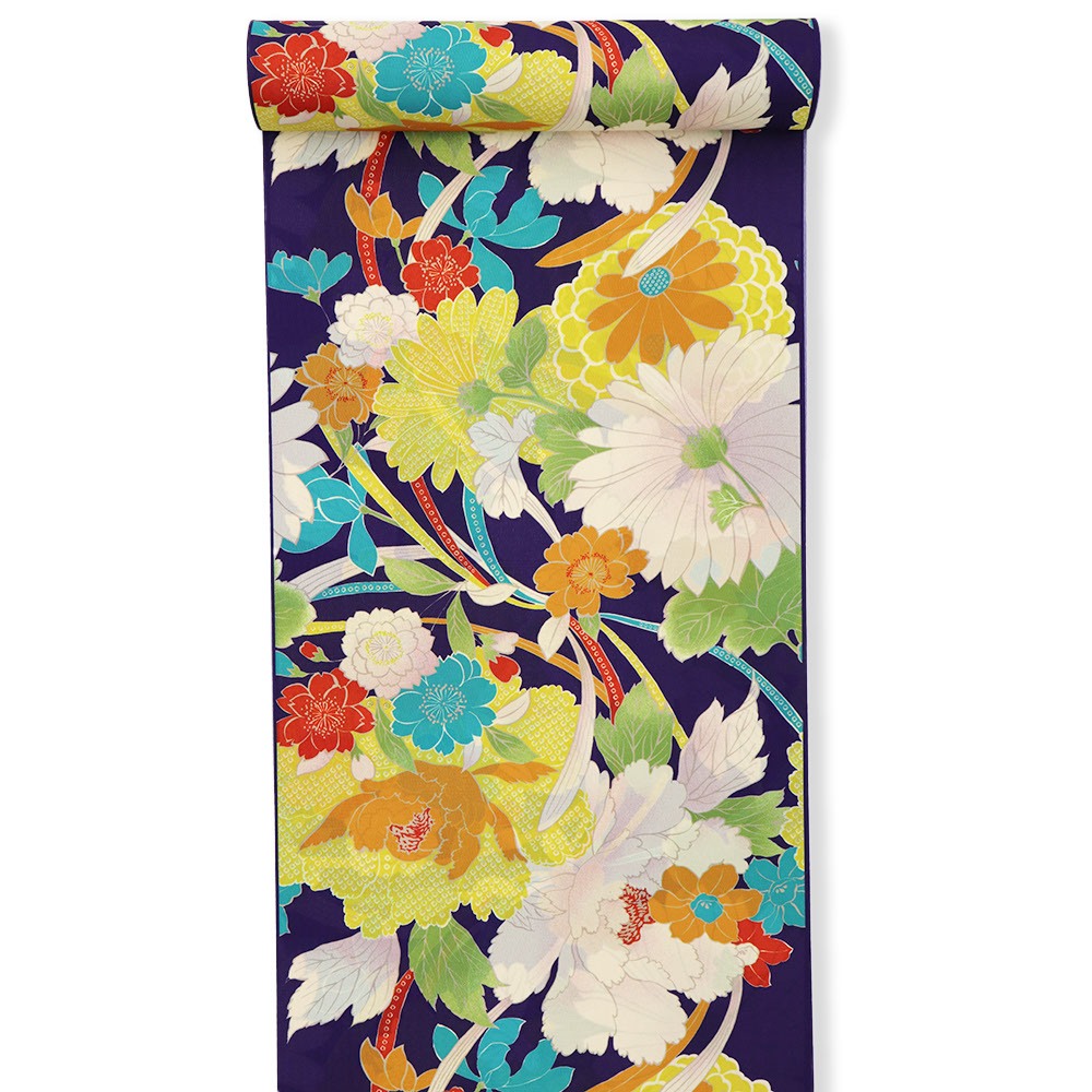 紫色の地色に、牡丹や桜、菊を配した華やかな一枚です。花弁一枚一枚に細やかな線や模様が入れられ、こだわりが感じられるデザイン。袖口等からチラリと覗いた時にも気分が上がりそうです。