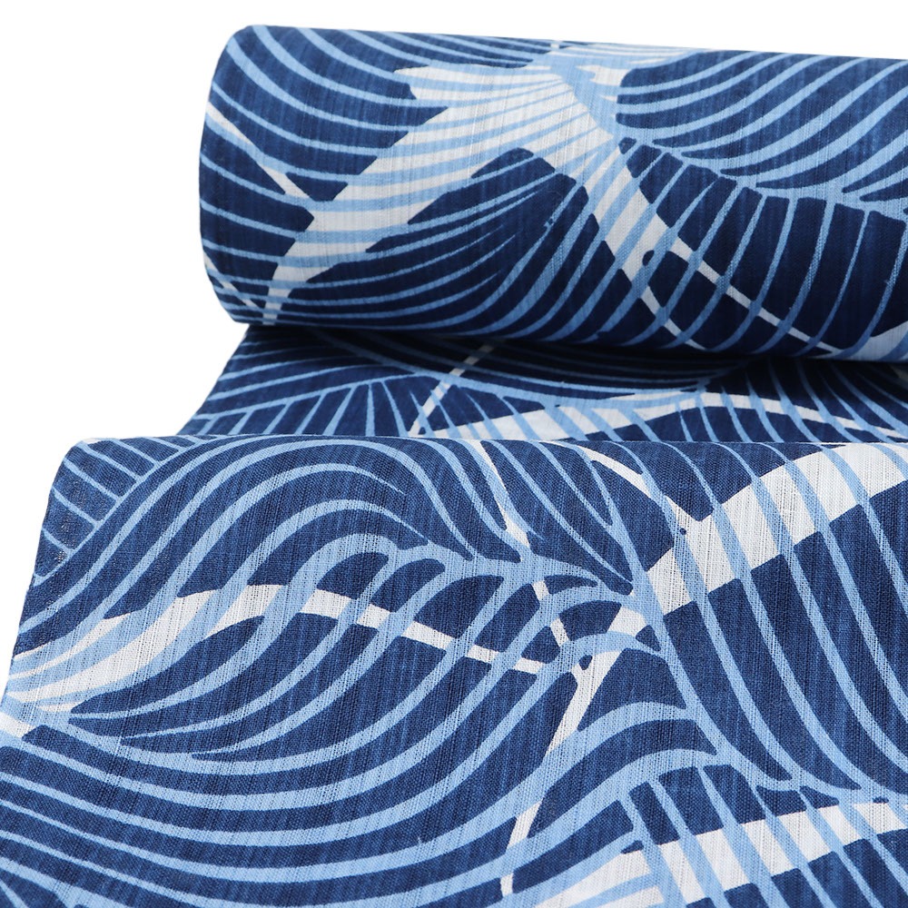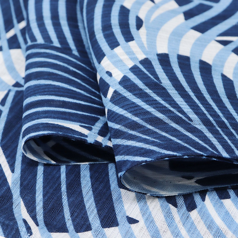 夏に嬉しい綿麻素材に藍捺染した清涼感あふれる一本です。麻の通気性と清涼感と、綿の柔らかさや肌触りの良さを併せ持った綿麻は、吸湿性・放熱性にも優れ、汗ばむ季節でも快適な着心地に。本麻のものよりもシワになりにくい特徴もあり、機能性抜群です。
