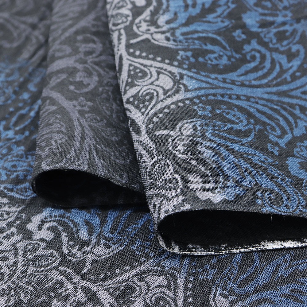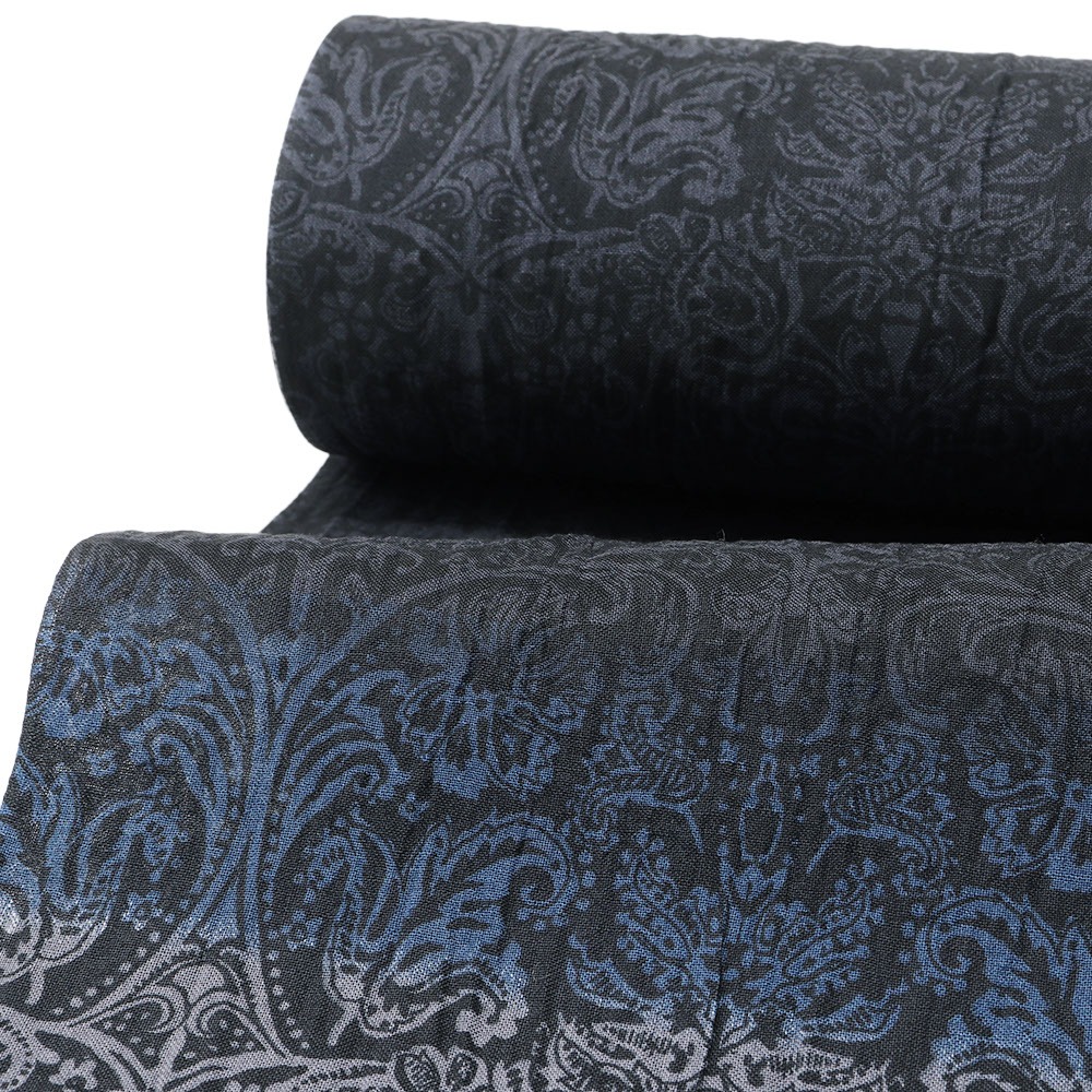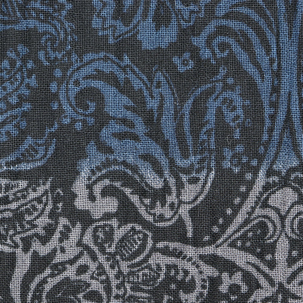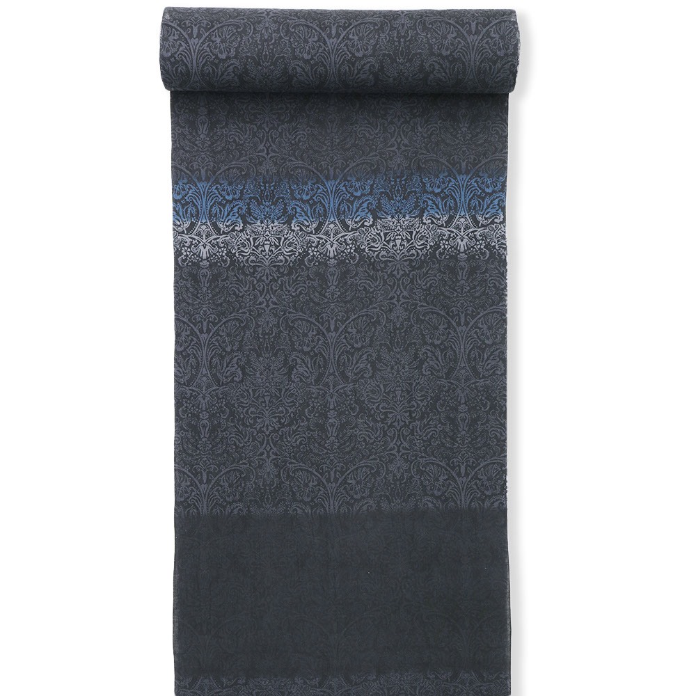 細やかなダマスク模様に、青や灰で横段模様を浮かべたシックで大人な一枚。長襦袢や足袋などを合わせて夏着物にしたり、半巾帯を締めて浴衣にしたり、表現したいスタイルに合わせてコーディネートをお楽しみいただけます。