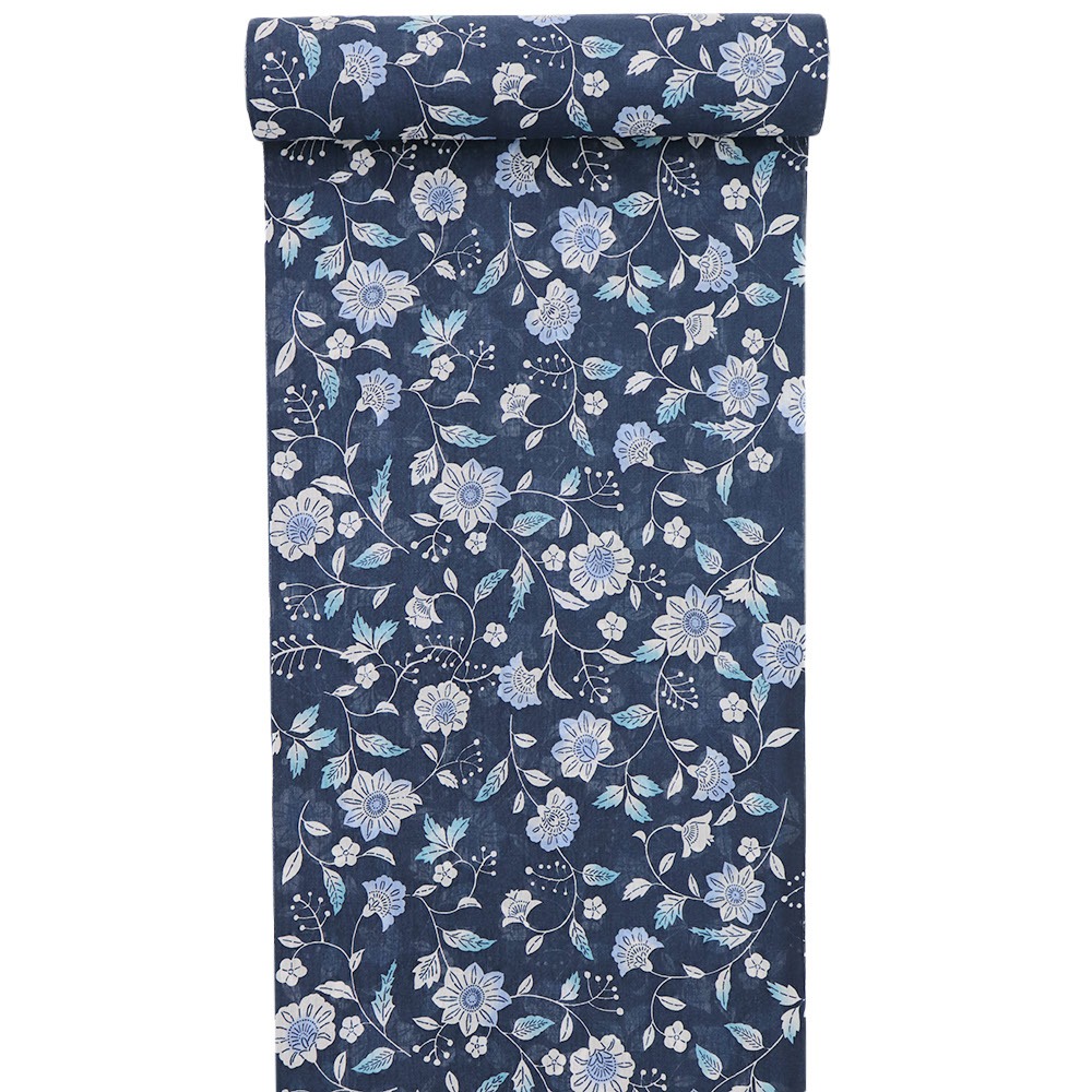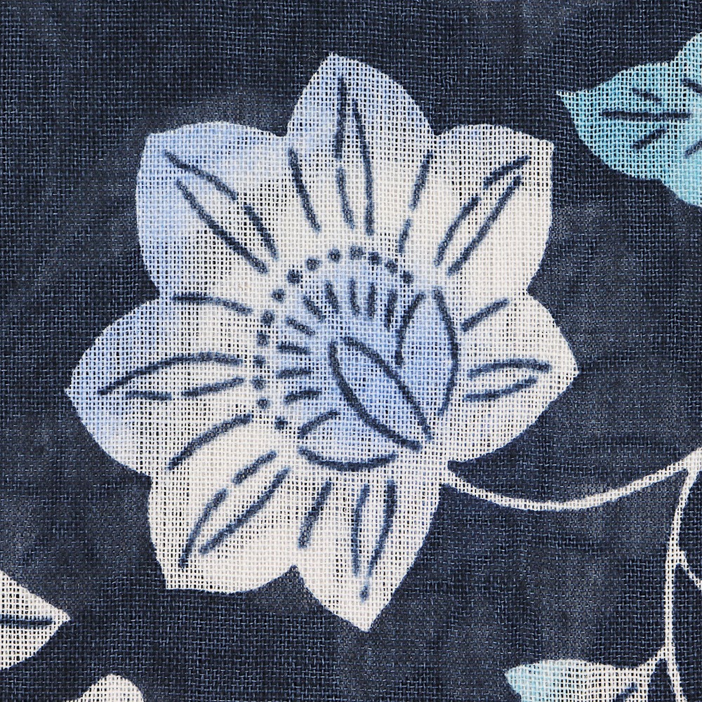 暑い季節をシックに彩るネイビーカラーと、定番模様の花唐草は柔らかなニュアンスをプラス。身に着けても目に見ても涼やかかつ上品なデザインを目指しました。