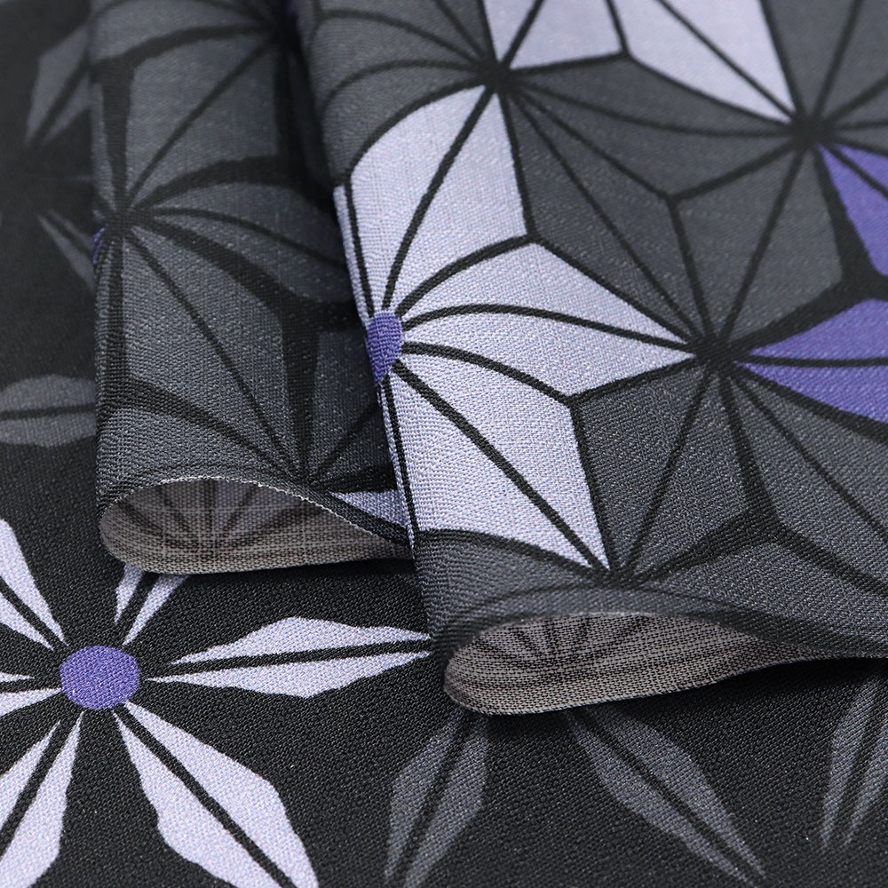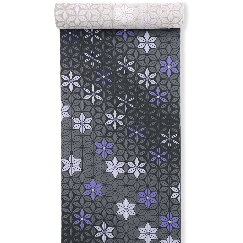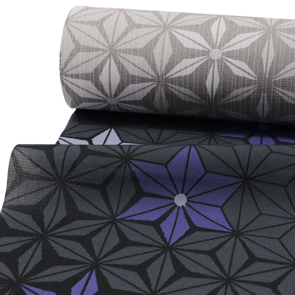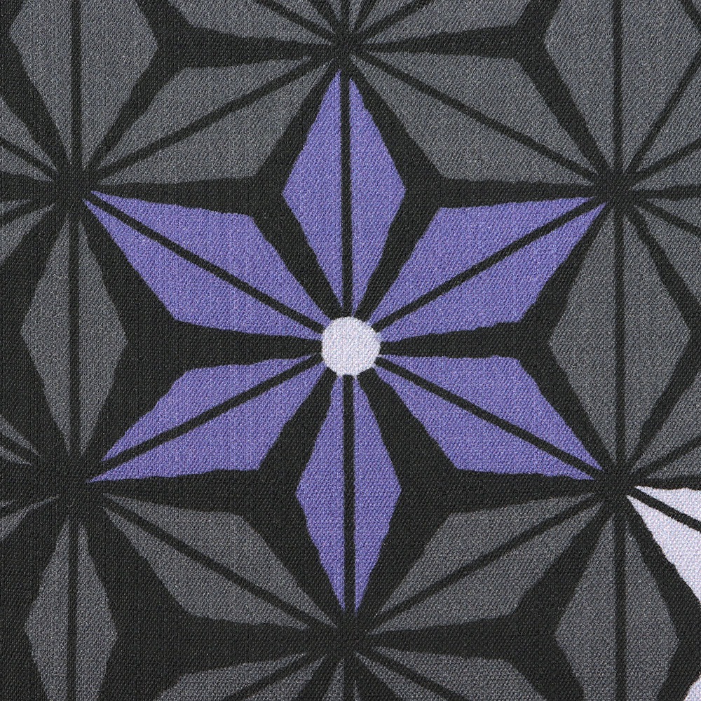 こちらは、2026年の新作デザイン「麻の葉」。麻の葉を一面に散りばめながら、形を少しずつ変化させることでグラデーションのような質感に。黒、紫、灰色が複雑に混ざり合い、表情豊かな着姿を表現します。