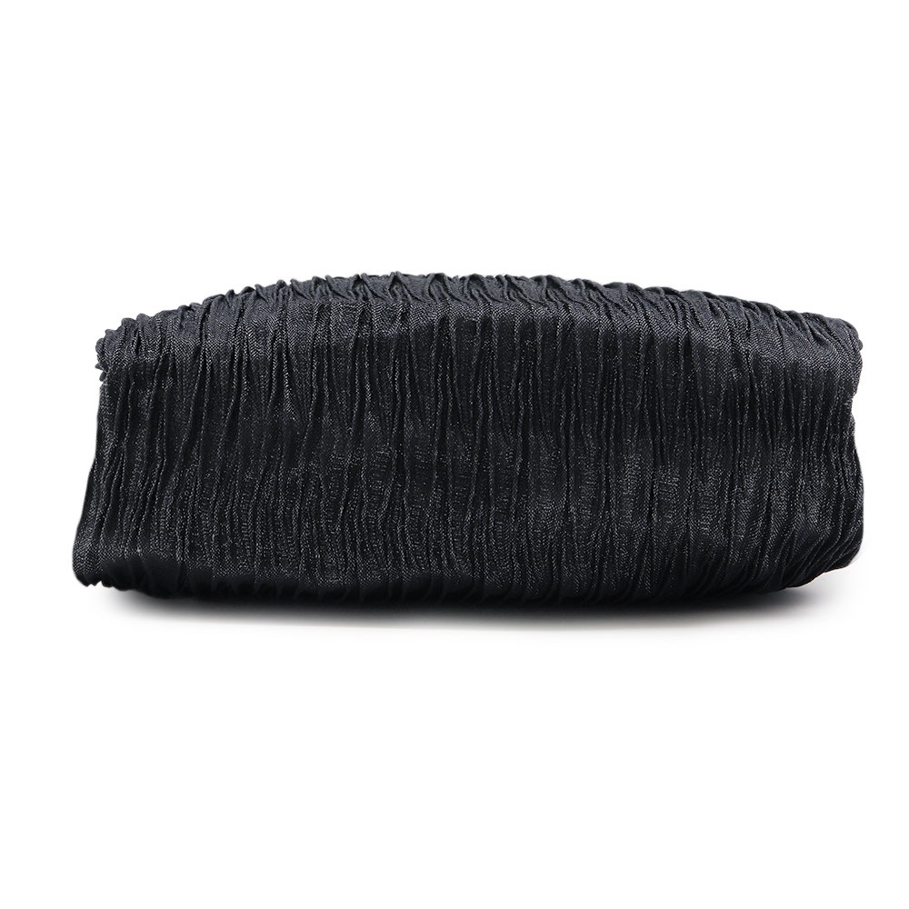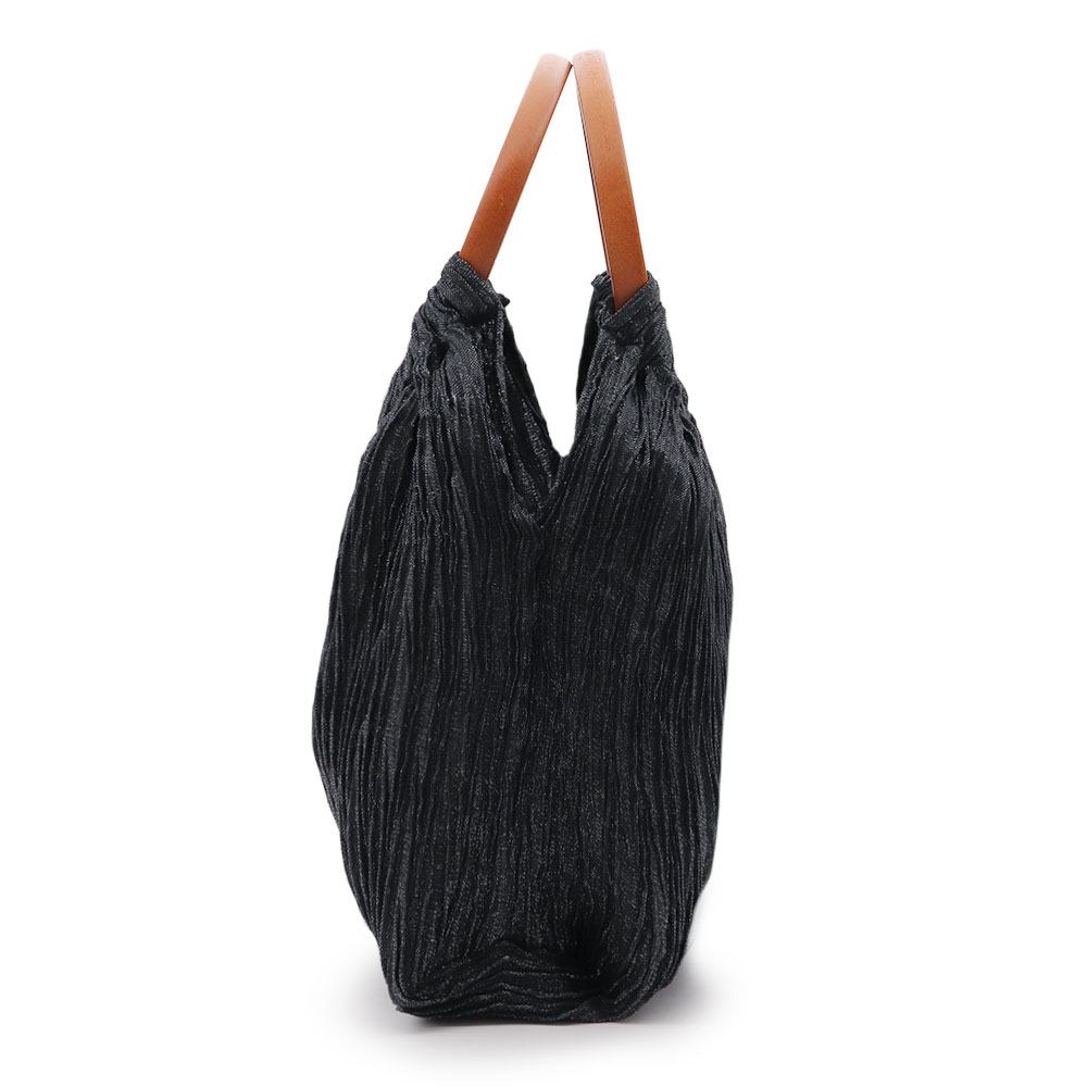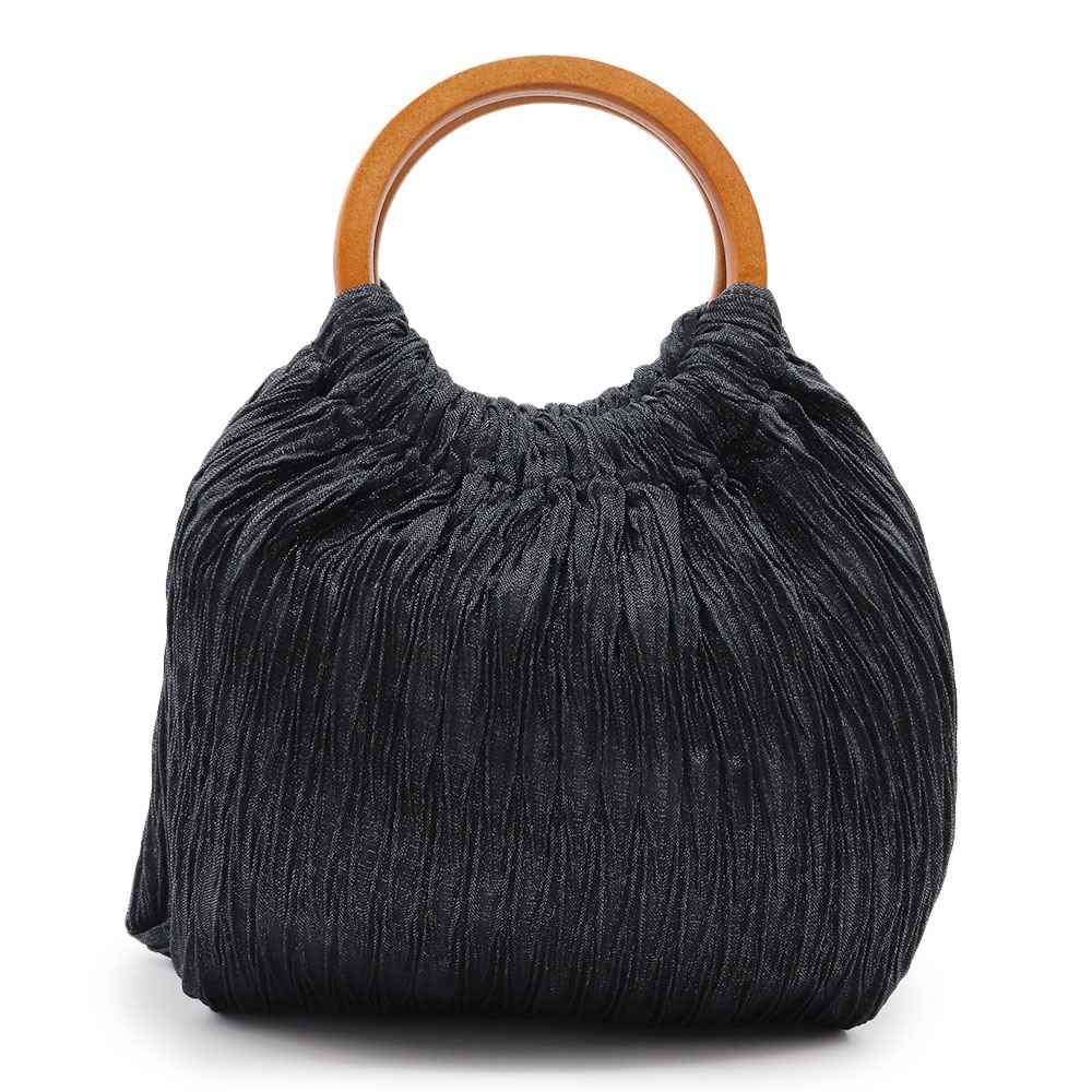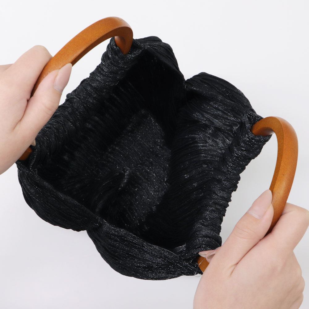 ギャザーのような大きなシボを寄せ、クシュっとしたエアリーな見た目が可愛らしいデザイン。織り込まれたラメ糸が、手元の動きに合わせてきらめきます。ふっくらとしたシルエットに加えて、手に馴染むリング型の木製ハンドルもコーディネートのアクセントになってくれそうですね。